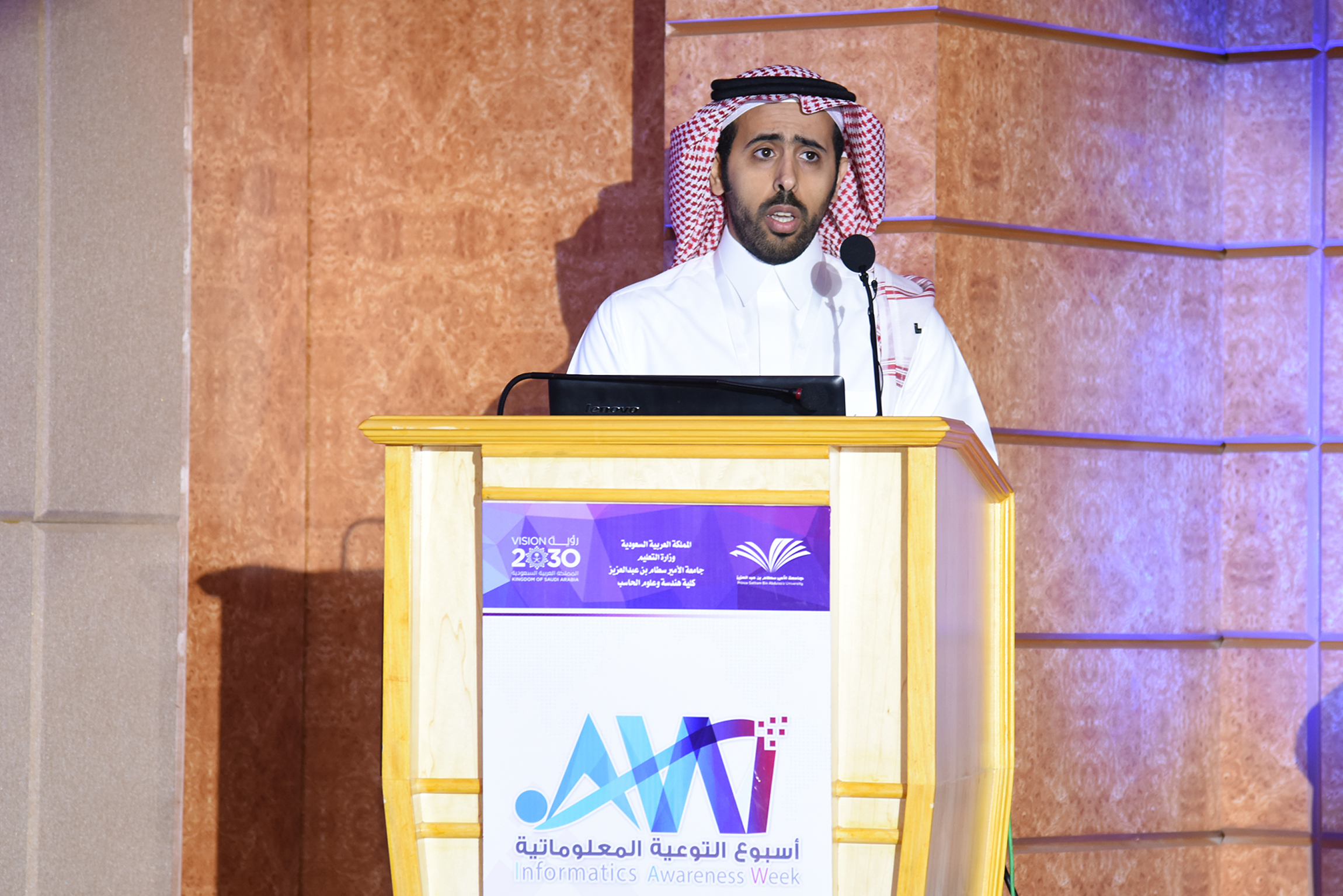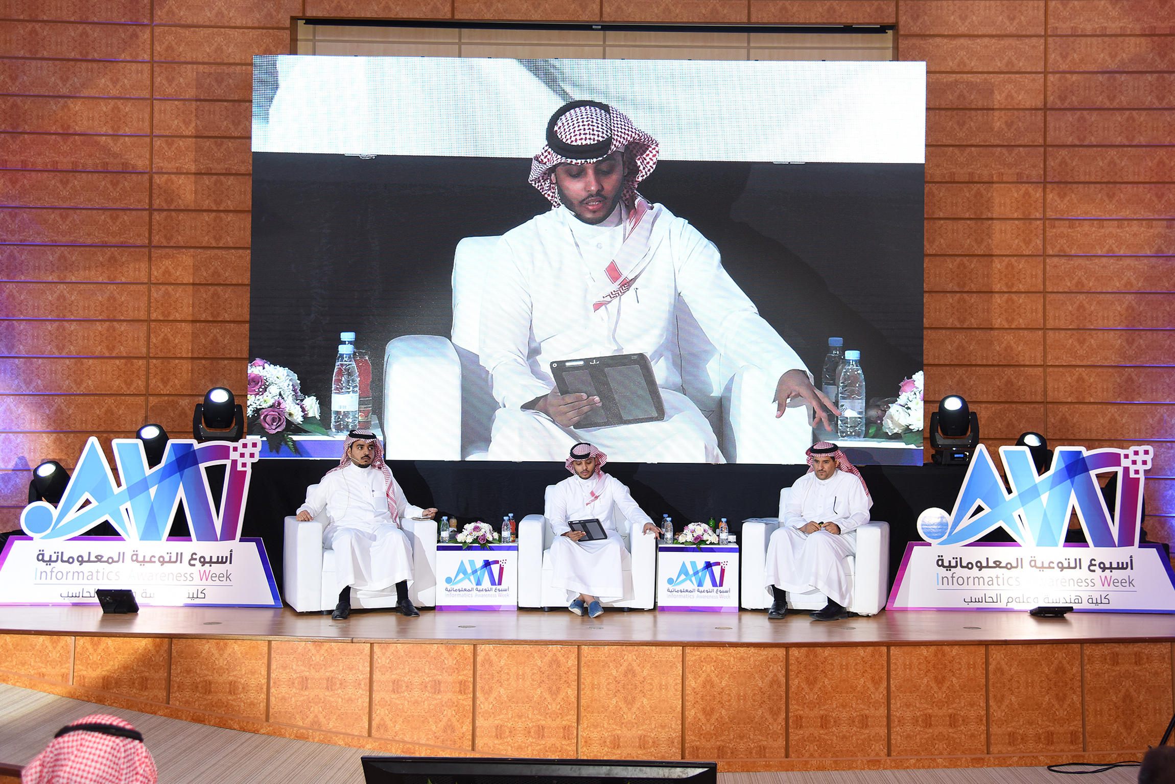بعد ذلك بدأت أولى فعاليات اليوم الأول لأسبوع التوعوية المعلوماتية بحلقة نقاش عن (تطور الإنترنت في المملكة وأبرز مخاطر الجرائم المعلوماتية) للدكتور إبراهيم الفريح مدير عام خدمات الإنترنت في هيئة الاتصالات وتقنية المعلومات، والدكتور هاني الزيد نائب المركز الوطني لتقنية أمن المعلومات في مدينة الملك عبدالعزيز للعلوم والتقنية، وأدار حلقة النقاش الدكتور لؤي السدمي، تحدث الدكتور الفريح والدكتور الزيد عن الإنترنت وتطورها في المملكة العربية السعودية وبعض مخاطر الإنترنت ودور هيئة الاتصالات وتقنية المعلومات في الحد من هذه المخاطر والتحديات والعقبات، وتطرقوا إلى إحصائيات عن الجرائم المعلوماتية على مستوى العالم وكيفية الحماية من هذه الجرائم الإلكترونية.