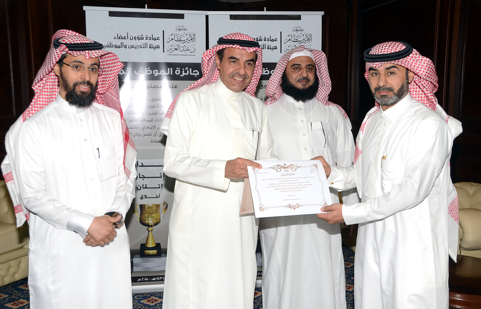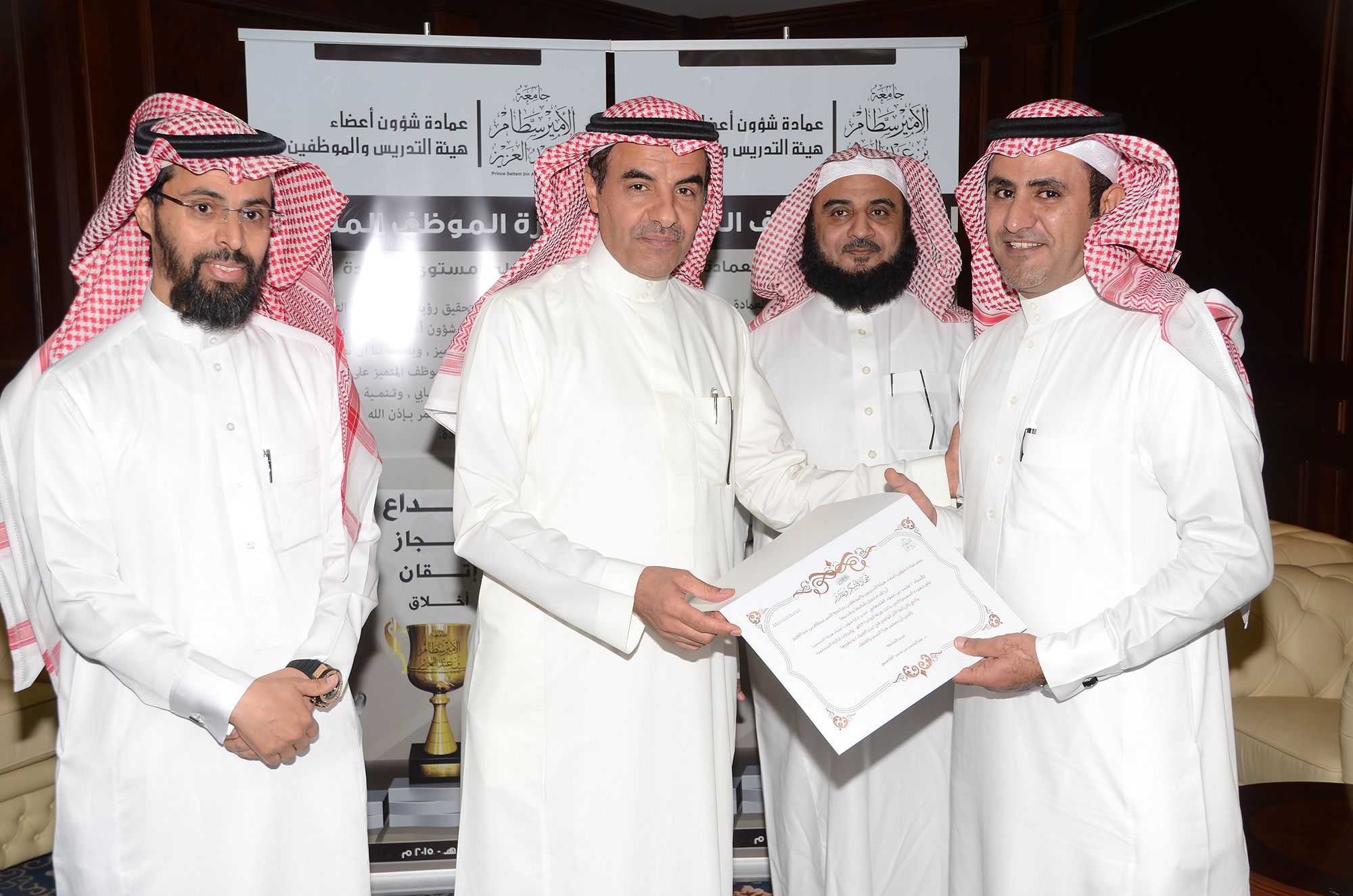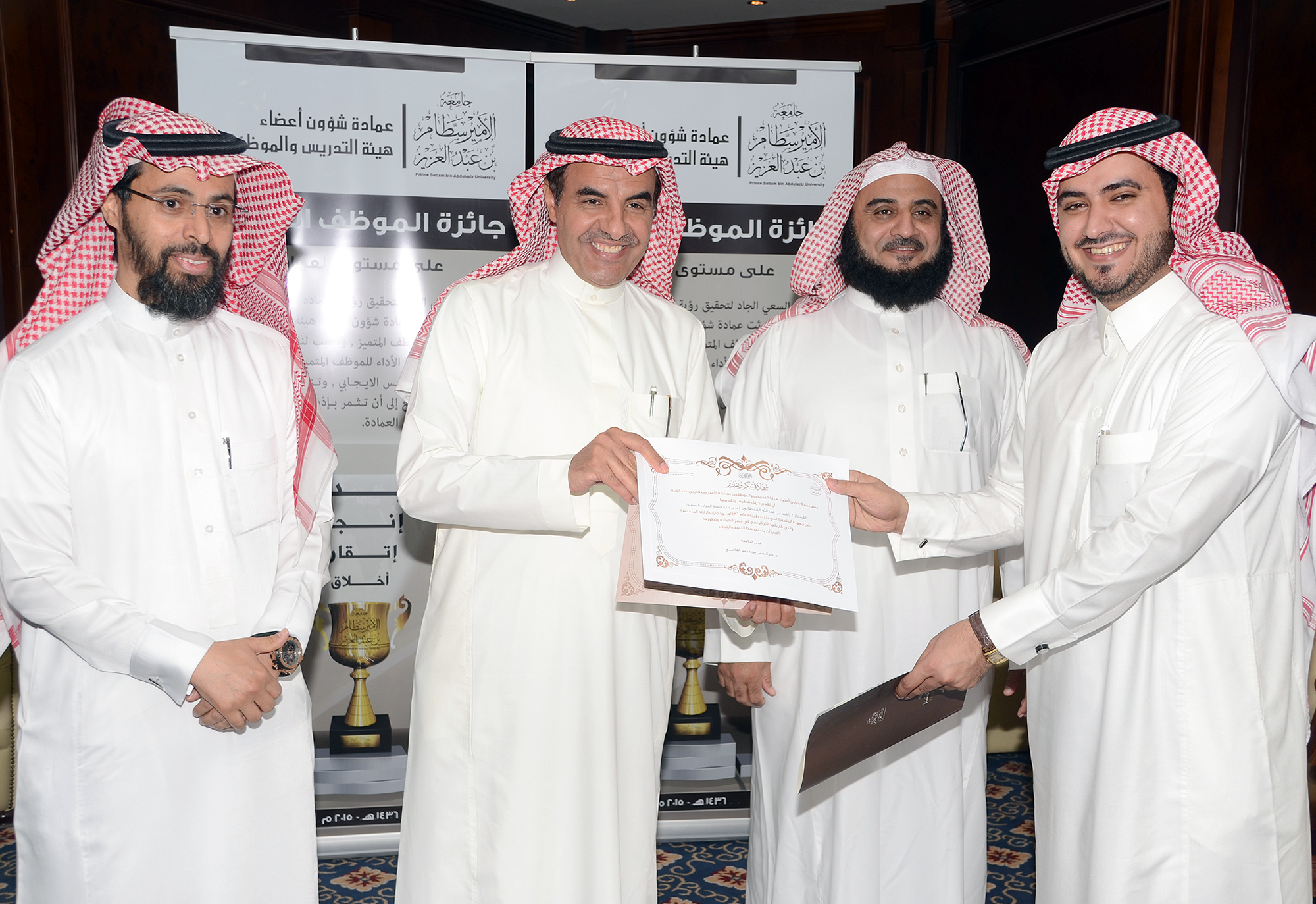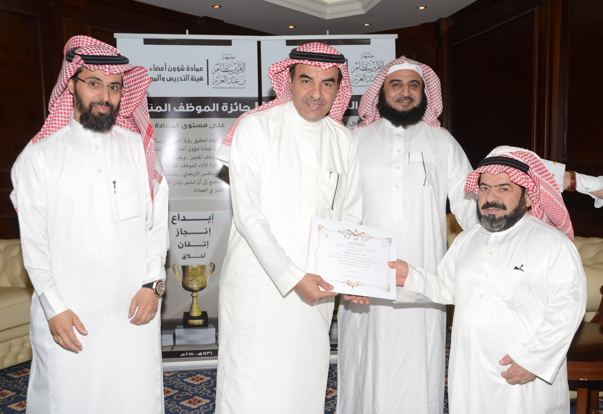 كما تم كذلك تكريم الموظفين الحائزين على جائزة الموظف المتميز بنسختها الرابعة للعام الجامعي 1435/1436 هـ وهم :