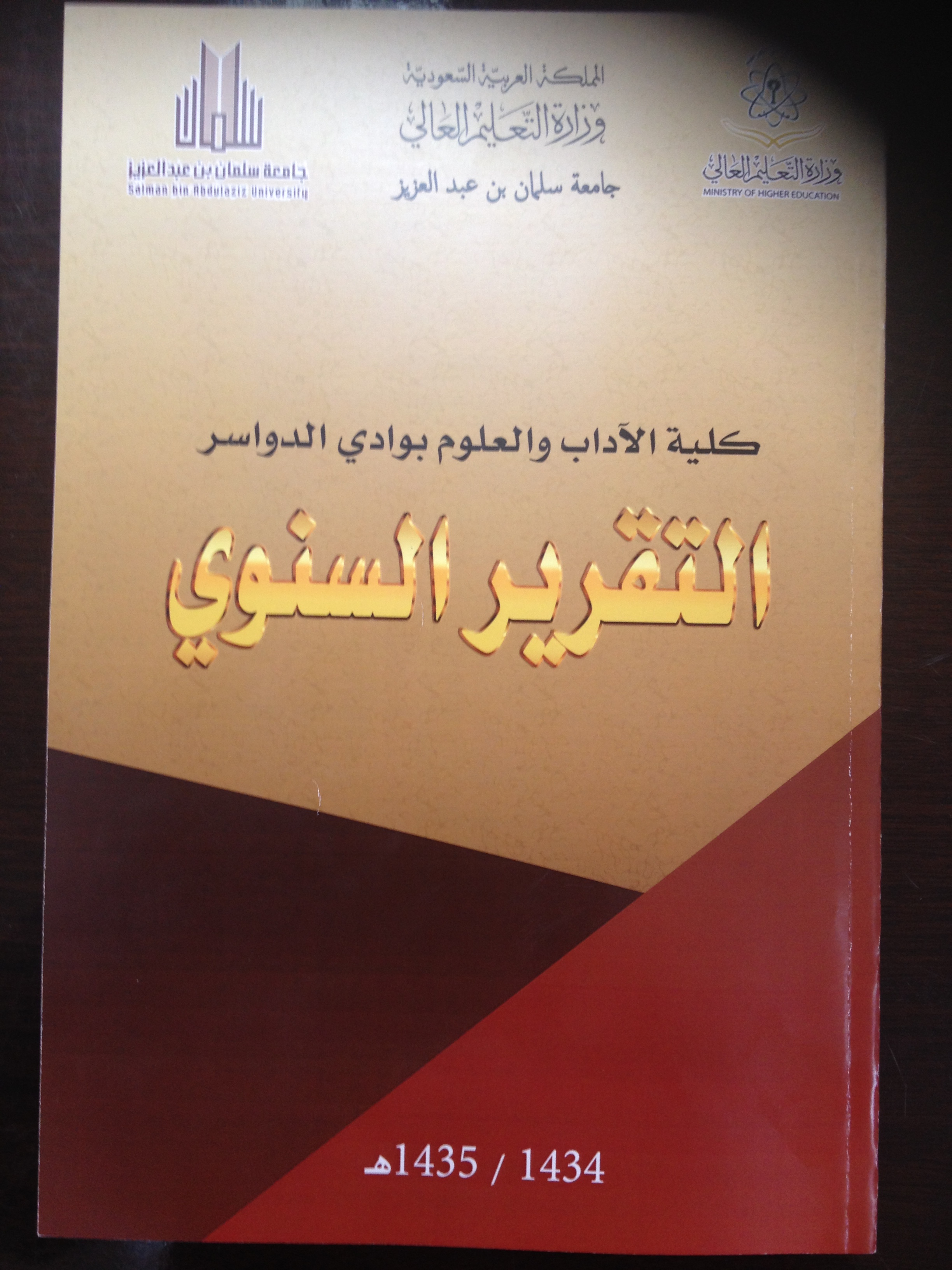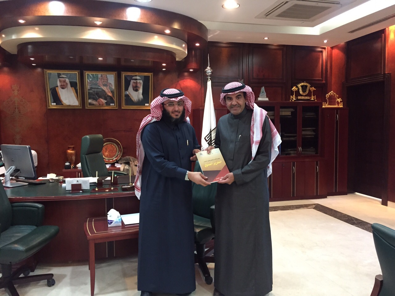 نيابة عن عميد كلية الآداب والعلوم بوادي الدواسر الدكتور ناصر بن محمد المهيزع قام وكيل الكلية الدكتور عبدالله بن محمد ال تميم بتسليم التقرير السنوي لمعالي مدير الجامعة الدكتور عبدالرحمن بن محمد العاصمي ، وذلك عن العام الجامعي المنصرم 1434هـ ـ 1435هـ