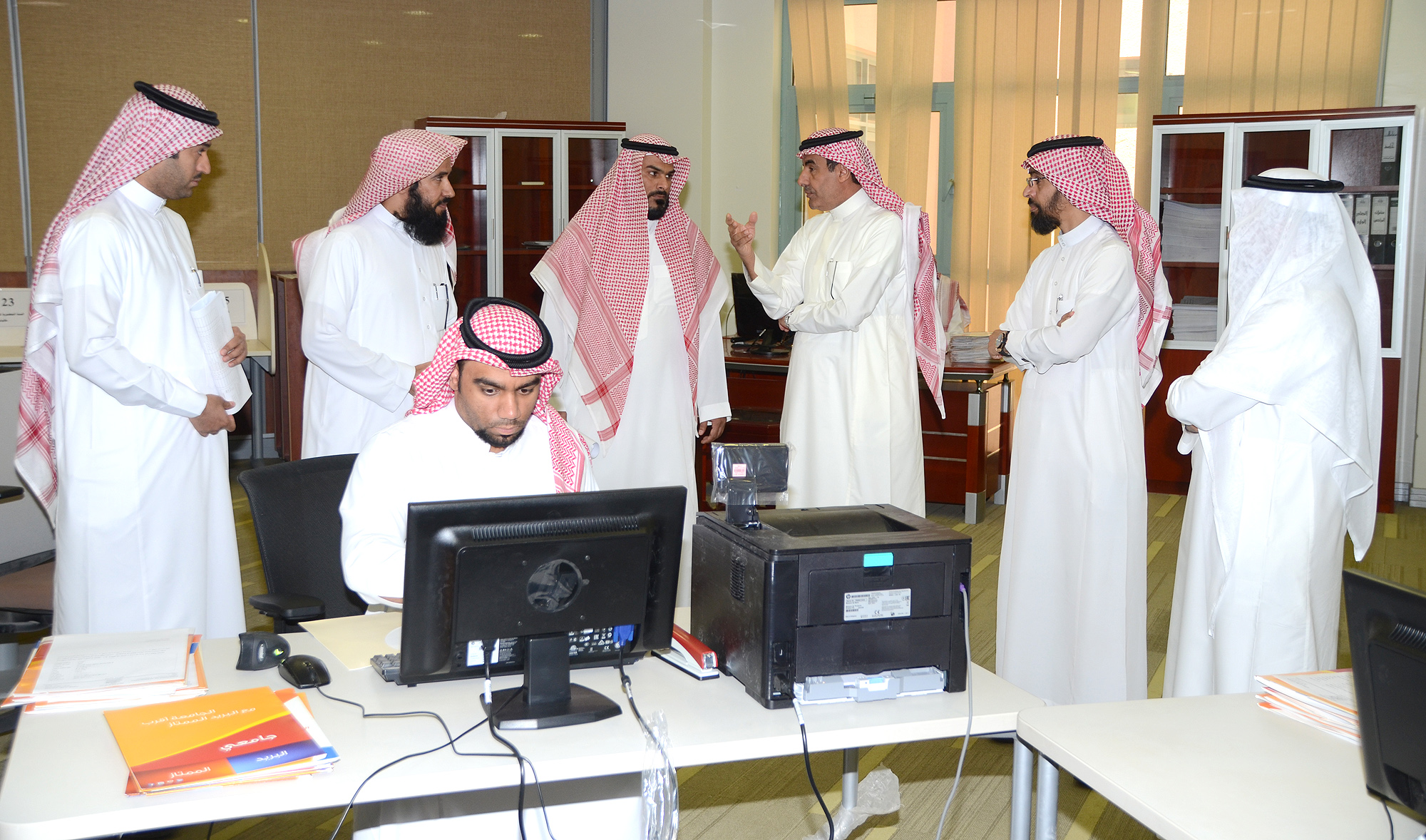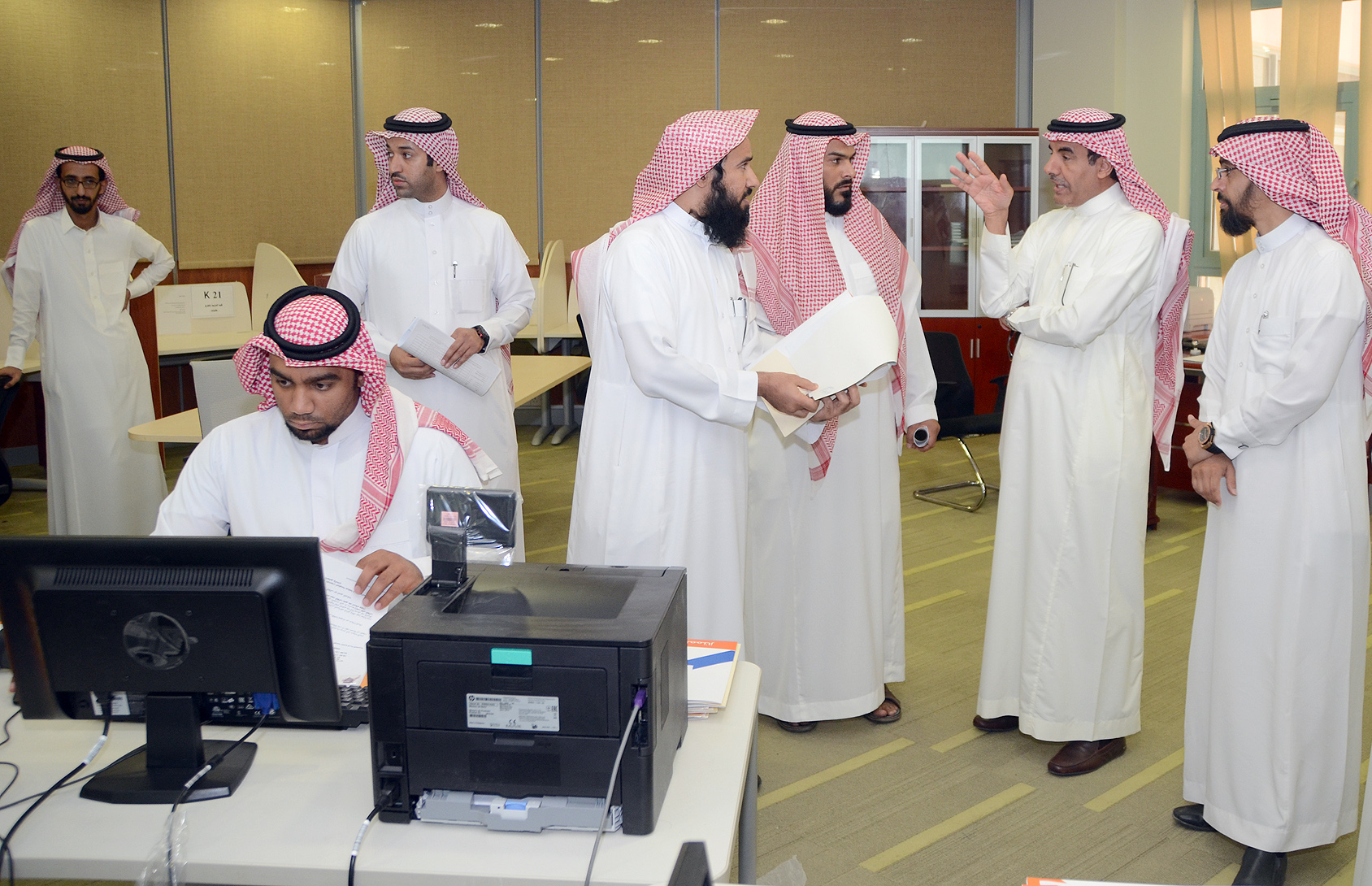 وكان في استقباله لدى وصوله عميد القبول والتسجيل الدكتور عبدالعزيز بن محمد الصقر الذي قدم في بداية الزيارة شرحاً مفصلاً عن آلية سير العمل ابتداء من استلام ملف الطالب من البريد الممتاز حتى إنهاء إجراءات تثبيت قبوله بالجامعة حسب التخصص الذي تم قبوله فيه مؤكدًا أن جميع هذه الإجراءات تتم بشكل آلي عبر بوابة القبول الإلكتروني، كما اطلع معاليه خلال الجولة على الإجراءات الإدارية والتنظيمية المعمول بها في العمادة.