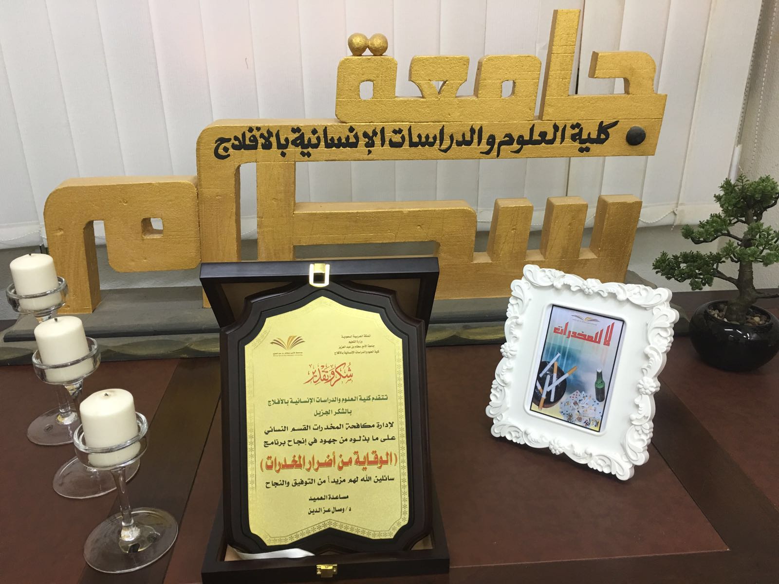 في ختام البرنامج سلمت مساعدة العميد د.وصال عز الدين درع للمديرية استلمته أ/هياء العتيبي اعترافاً بمجهودات مديرية مكافحة المخدرات وشهادات شكر خاصة لمن شارك في انجاح البرنامج .