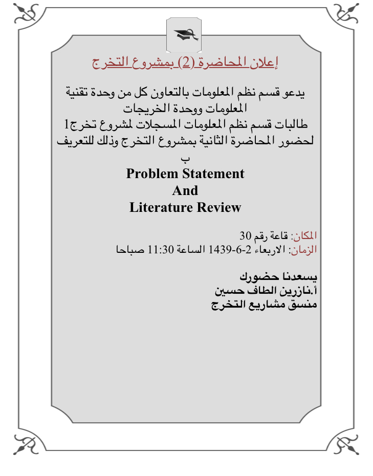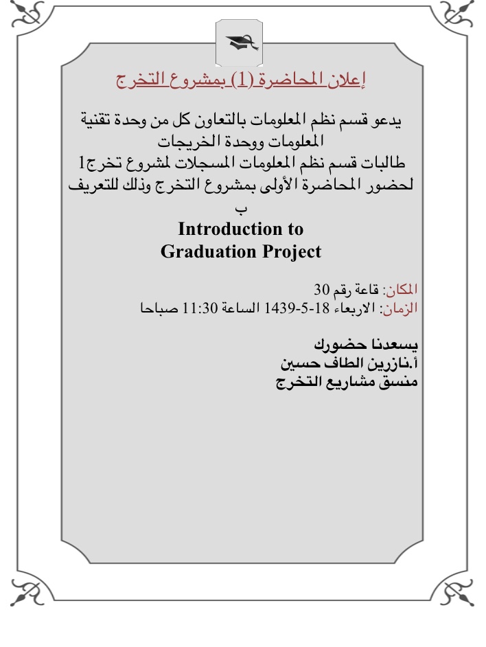 Introduction to Graduation Project. ،استهدفت المحاضرة طالبات قسم نظم المعلومات المسجلات لمشروع تخرج 1 وعقدت في قاعة رقم 30 يوم الأربعاء 8/ 5/ 1439 هـ الساعة 11:30 صباحاً،كما نفذ القسم المحاضرة الثانية بمشروع التخرج وذلك للتعريف