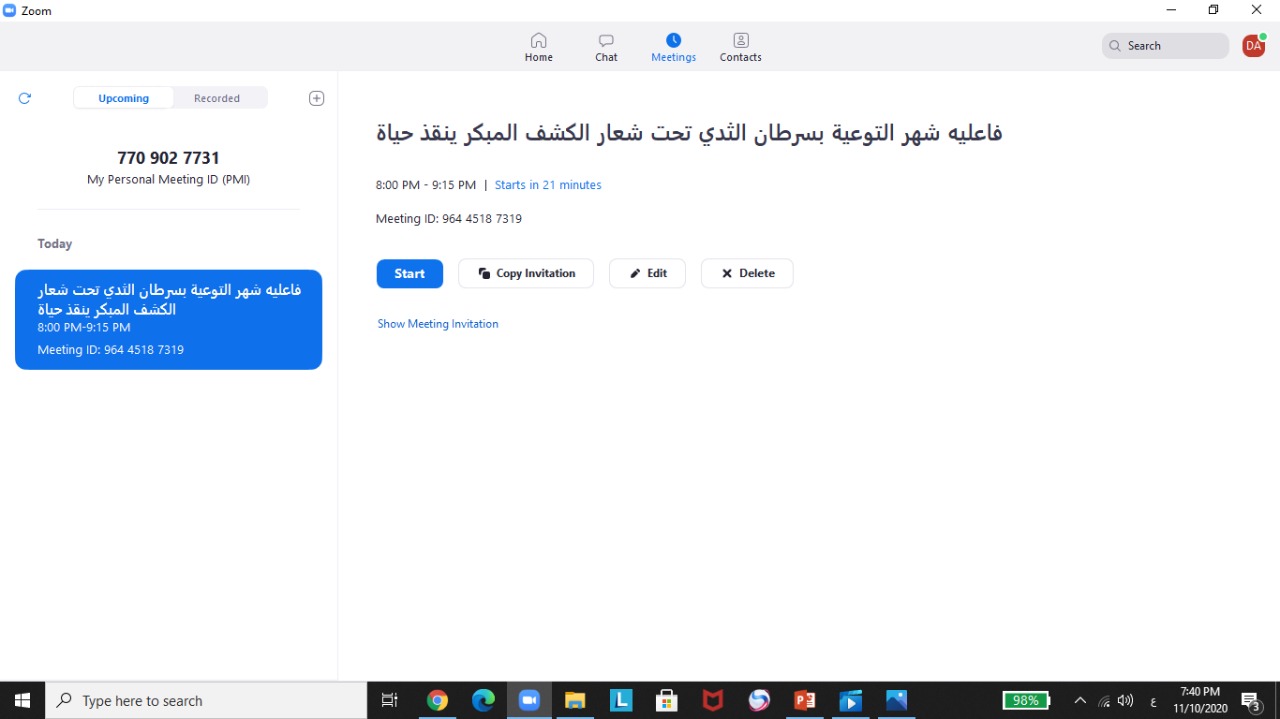 تحتفل دول العالم كل عام خلال شهر أكتوبر بشهر التوعية بسرطان الثدى. ويعتبر سرطان الثدى السرطان الأول في المملكة انتشارا وعند النساء، وأكثر من 55% من حالات السرطان بالمملكة يتم كشفها بمراحل متأخرة مما يقلل من فرصة الشفاء منه (وزارة الصحة). لذلك; نظمت وحدة العمل الطلابي ممثلة في الأنشطة الثقافية و الإجتماعية و المجلس الطلابي و وحدة خدمة المجتمع بكلية العلوم الطبية التطبيقية بجامعة الأمير سطام بن عبد العزيز بوادي الدواسر فاعلية تحت عنوان " شهر التوعية بسرطان الثدى تحت شعار الكشف المبكر ينقذ حياة" وذلك يوم الثلاثاء الموافق 24-3-1442 هـ في تمام الساعة 8 مساءًا عبر برنامج زووم. هدفت الفاعلية إلي زيادة الوعي بأهيمة الكشف المبكر والفحص الذاتي للوقاية من مضاعفات سرطان الثدى. وقد تم تقديم ثلاث محاضرات توعوية ومشاركة من طالبات المجلس الطلابي: المحاضر الأولي بعنوان " الكشف المبكر لسرطان الثدي «الكشف المبكر ينقذ حياة» " قدمتها سعادة الدكتورة عطيات محمد حسن (مشرفة وحدة العمل الطلابي وخدمة المجتمع) ومن أبرز ما تناولته المحاضرة العوامل التي تزيد من خطر الإصابة بسرطان الثدي، وكيفية تقليل إحتمالية الإصابة، و إرشادات الكشف المبكرلسرطان الثدي. ثم تلتها محاضرة بعنوان " الغذاء و السرطان " قدمتها سعادة الدكتورة ماجدة الجميل (مساعدة العميد لشؤون الطالبات): وقد أوضحت سعادتها أن تناول أغذية صحية قد يحول دون الإصابة بالسرطان أو تأجيل وقوعه وذلك بناءًا على دراسات علمية موثقة، أيضا: أهم الأغذية الصحية التي تقينا من أمراض السرطان، كذلك الأطعمة التي تزيد من احتمالية الإصابة. ثم تلتها محاضرة بعنوان " الإتجاهات الحديثة في علاج سرطان الثدى" قدمتها سعادة الدكتورة سمية عايش (أستاذ مساعد بقسم علوم المختبرات الطبية) وقد أشارت سعادتها إلي طرق العلاج و أحدث طرق علاج سرطان الثدي بدون الجراحة مثل العلاج بالتبريد. وقد شارك طالبات المجلس الطلابي بفقرة قدمن فيها قصص واقعية لتحفيز الطالبات على ضرورة الفحص الذاتي والكشف المبكر لسرطان الثدى. وقد لاقت الفاعلية استحان وترحيب من الحضور. تم التنسيق والترتيب للفاعلية من قبل مشرفة وحدة العمل الطلابي وخدمة المجتمع بالكلية الدكتورة عطيات محمد حسن