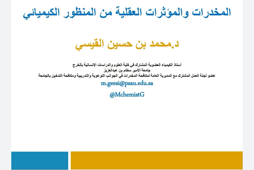 أقامت كلية إدارة الأعمال في حوطة بني تميم بالتعاون مع لجنة العمل المشترك مع المديرية العامة لمكافحة المخدرات في الجامعة محاضرة عن بُعد، تحت عنوان: (المخدرات والمؤثرات العقلية من المنظور الكيميائي)، ألقاها د. محمد بن حسين القيسي عضو اللجنة والأستاذ المشارك في قسم الكيمياء بكلية العلوم والدراسات الإنسانية في الخرج، يوم الثلاثاء ١٤٤٢/٨/١٧هـ. تحدث د. القيسي في المحاضرة عن التركيب الكيميائي لبعض أنواع المخدرات والمؤثرات العقلية ودوره في أثرها التدميري على صحة المتعاطين وأدمغتهم. كما حذر من أنواع المخدرات والمؤثرات العقلية كافة، وقام بعرض عدد من المشاهد والصور لحال المتعاطين والمدمنين. وفي ختام المحاضرة وجّه د. محمد القيسي أسئلة للحضور عن محتوى المحاضرة، وسينال الفائزون جوائز مالية مقدّمة من الكلية. تجدر الإشارة إلى أن المستهدفين بالبرنامج هم طلاب الكلية، وطلاب فرع كلية التقنية في حوطة بني تميم، ويأتي هذا البرنامج امتدادًا للجهود التي تبذلها الجامعة ممثلةً بكلياتها ولجان العمل بها في سبيل توعية الطلاب، وتحصين أفكارهم مما يلوثها من الشبهات والشهوات.