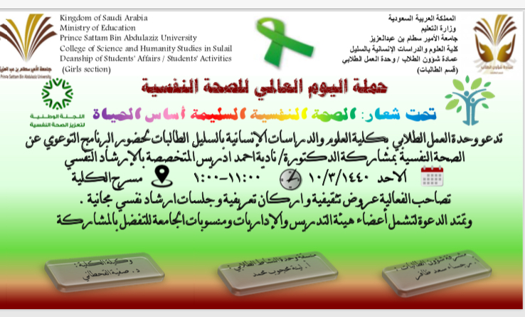 في إطار الاهتمام العالمي بالصحة النفسية نظمت وحدة العمل الطلابي بكلية العلوم والدراسات الإنسانية في السليل محاضرة بعنوان (الصحة النفسية للطالبة الجامعية ) قدمتها الدكتوره نادية احمد ادريس المتخصصة في علم النفس الإرشاد ومشرفة وحدة الإرشاد النفسي بالكلية وذلك يوم الأحد الموافق 10/3/1440 بحضور العديد من الطالبات ومنسوبات الكلية