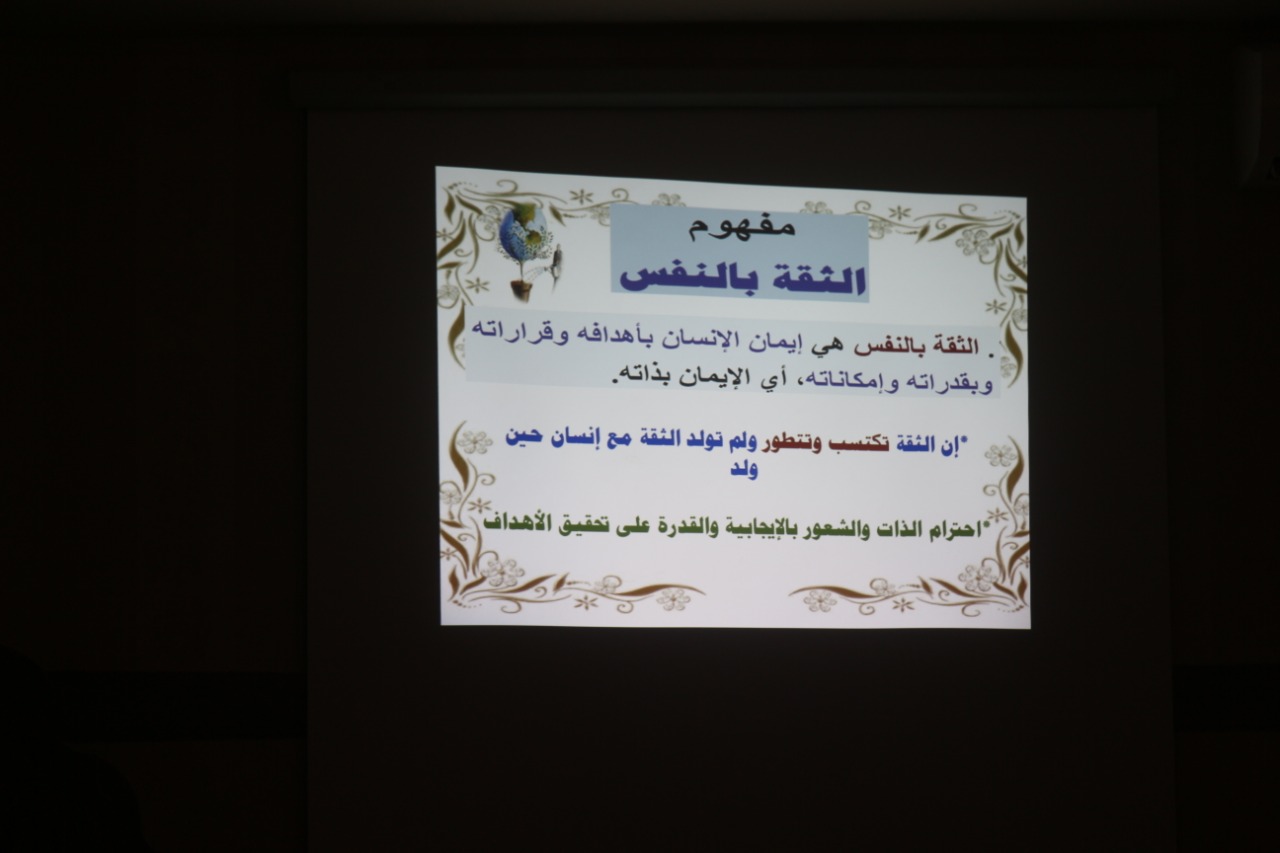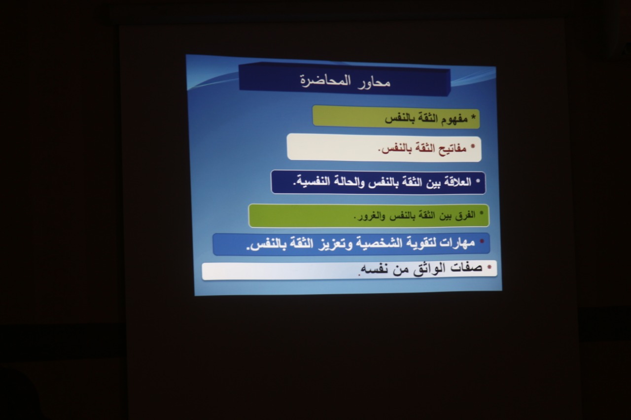 قامت وحدة الإرشاد الأكاديمي بكليات الأفلاج (قسم الطالبات) يوم الأحد الموافق 1441/7/6هـ الساعة التاسعة صباحاً في القاعة الرياضية بتنظيم محاضرة بعنوان (الثقة بالنفس والنجاح الأكاديمي) من تقديم أ. منى البهي، تهدف المحاضرة إلى التعريف بمفهوم الثقة بالنفس، وقد تحدثت فيها عن العلاقة بين الثقة بالنفس والحالة النفسية، ومفاتيح الثقة بالنفس، وصفات الواثق بنفسه، ثم وضحت الفرق بين الثقة بالنفس والغرور، كما ذكرت مهارات لتقوية الشخصية وتعزيز الثقة بالنفس، واختتمت المحاضرة بالإجابة عن استفسارات الطالبات.