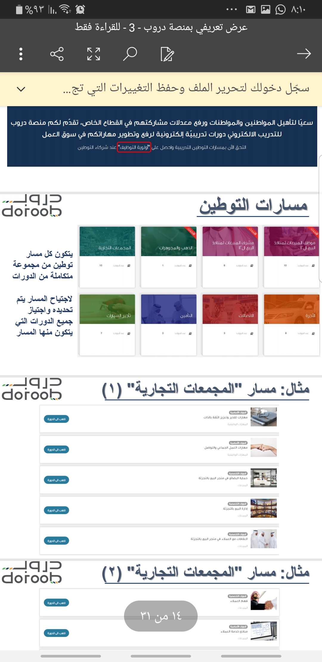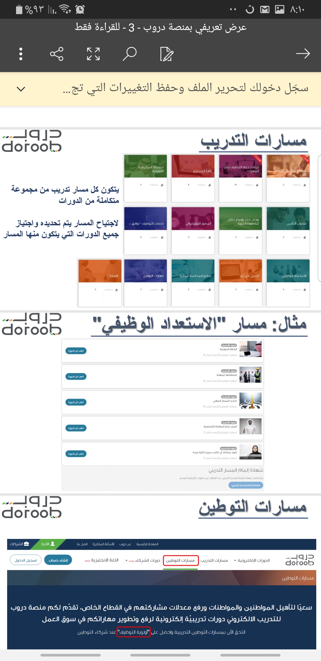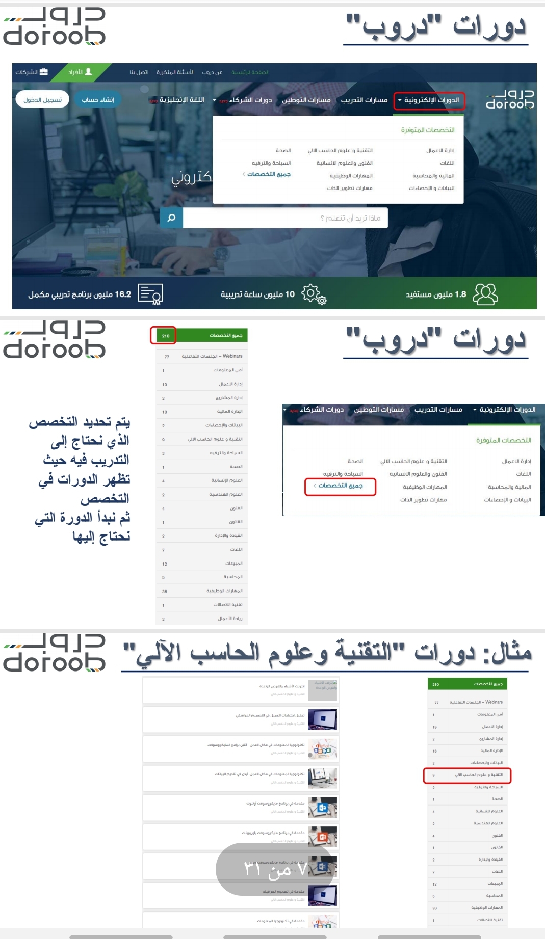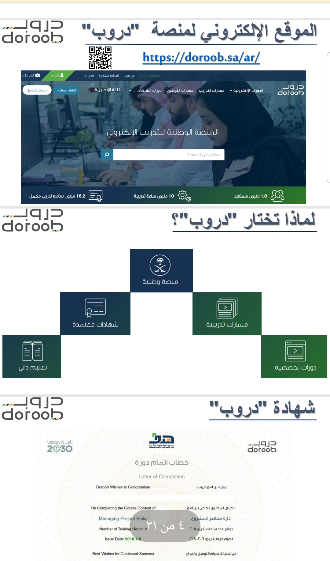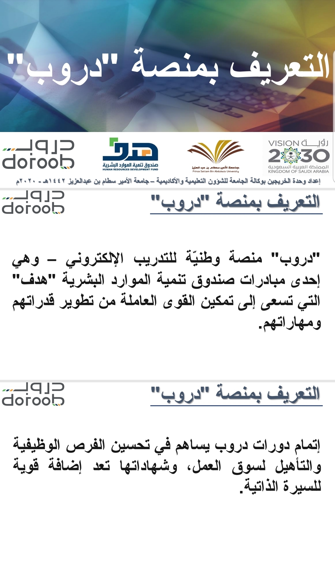 نظمت لجنة تنمية المهارات المهنية التابعة لوحدة الخريجات محاضرة اليوم الثلاثاء ٦/ ١٠ / ٢٠٢٠ في تمام الساعة السادسة مساء عبر منصة زووم تحت عنوان ( التعريف بمنصة دروب) التابعة لهيئة تنمية الموارد البشرية القتها د.سمية عايش الأستاذ المشارك بقسم المختبرات - منسقة الوحدة ولجنة تنمية المهارات المهنية وتم عرض الموضوع وشرحه بصورة مبسطة لكل من الخريجات والطالبات بقسمي التمريض والمختبرات وتوضيح مدى الاستفادة من هذا الموقع من حيث توفر الدورات التعليمية في شتى المجالات والتخصصات وتعلم اللغة الانجليزية والحصول على شهادات معتمدة عند اجتياز الدورات بنجاح بدون آي رسوم مادية وكيفية إنشاء الحساب على الموقع والتعديل فى الكفاءات والشهادات من وقت لأخر والاستفادة من الموقع في إتاحة فرص للتوظيف خاصة في كلاً من القطاع الحكومي و الخاص. ولاقت المحاضرة استحسان الحضور وتم إرسال الملف كاملًا لجميع الحضور للتعرف أكثر على الموقع.