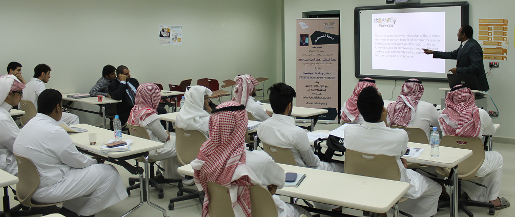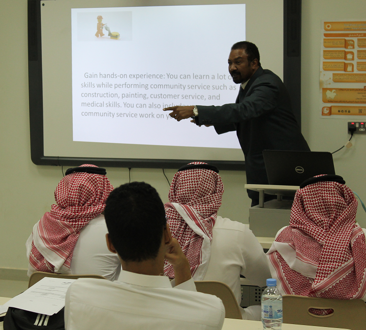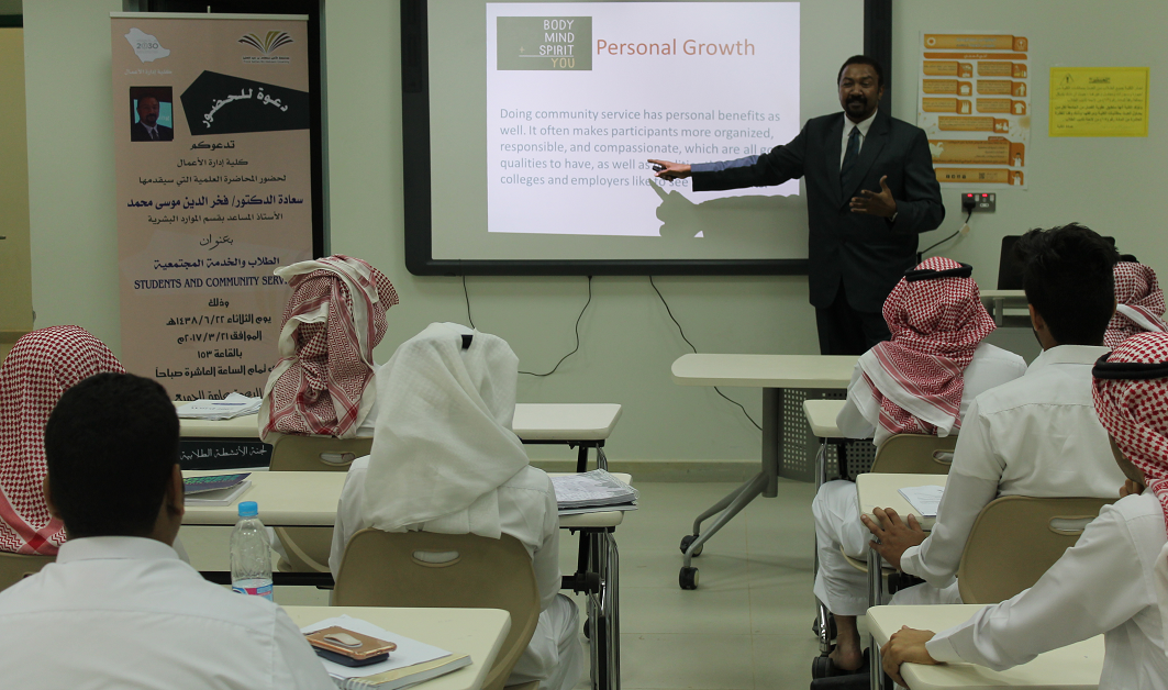 في إطار استعدادات الكلية للمشاركة في المسابقة المبادرات المجتمعية التي تنظمها عمادة شؤون الطلاب ، نظمت لجنة الأنشطة الطلابية محاضرة تثقيفية بعنوان:" Students & community Services "قدمها سعادة الدكتور فخرالدين محمد موسى عثمان الأستاذ المساعد بقسم إدارة الموارد البشرية بالكلية .