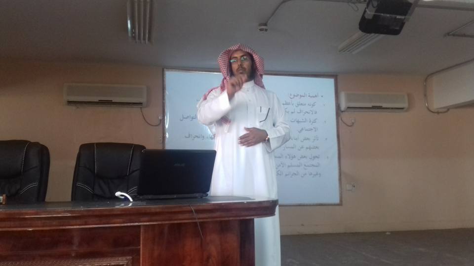 قدم المحاضرة الدكتور سعد محمد التميمي عضو هيئة التدريس بكلية التربية بوادي الدواسر بجامه الأمير سطام بن عبدالعزيز حيث وضح أن من يتولى كبر إشاعة الانحراف في أوساط الشباب المسلم هم: اليهود والمنظمات المنضوية تحت راياتهم ماسونية وشيوعية، أو الملاقية لهم في الهدف كالمنظمات الصليبية، فالجميع جندوا طاقاتهم للنيل من شبابنا من خلال البث المباشر والإنترنت وغيرهما من القنوات التي ابتدعوها لنشر سمومهم، وما من شك أن علاج الانحراف بكافة صوره يكمن في شيء واحد، يكمن في التمسك بالإسلام ذلك الدين القويم الذي جاء ليربي أفراده تربية كاملة جسداً وعقلاً وأخلاقاً وسلوكاً، فإنما ينشأ الانحراف دائماً من البعد عن الإسلام وعن التربية الإسلامية، فإذا أهملت تربية الأولاد كان ذلك سبباً رئيساً في انحرافهم .