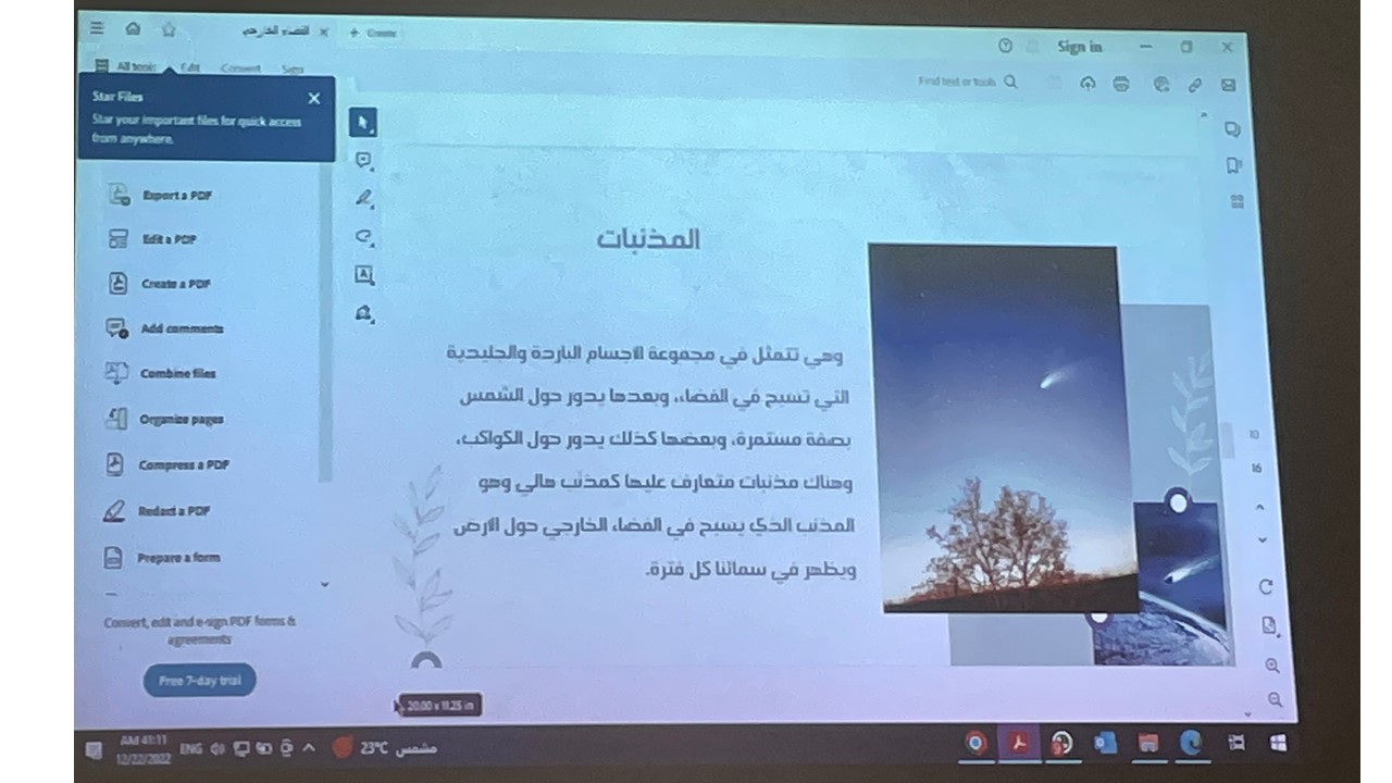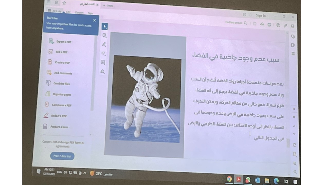 قدمت طالبات المسار الصحي - برنامج السنة التحضيرية محاضرة بعنوان" الفضاء الخارجي " يوم الخميس الموافق 1444/6/5هـ،تحت اشراف وتنظيم نادي العلوم الأساسية، ابتدأت المحاضرة بآيات من الذكر الحكيم عن الفضاء الخارجي ومساراته. تلاه الحديث عن النجوم والنيازك والكواكب والمذنبات والقمر والشمس والثقب الأسود وماذا يعني ونشأته وانعدام الجاذبية بالفضاء والأرض ومكوناته. كما تحدثن عن أول رائد فضاء سعودي وهو صاحب السمو الملكي الأمير سلطان بن سلمان. وقد تخلل اللقاء عرض فيديو عن حركة الكواكب ومساراتها ونالت هذه المحاضرة إعجاب الحضور حيث كانت محفزة ومشجعة للطالبات على القراءة والبحث. وختتمت بكلمة من أ. رجاء التي أشرفت على المحاضرة. شكرت فيها الحضور، كما قدمت شكرها للطالبات على جهودهن المتميزة والملحوظة. وتمنت لهن مزيدا من التقدم الابداع.