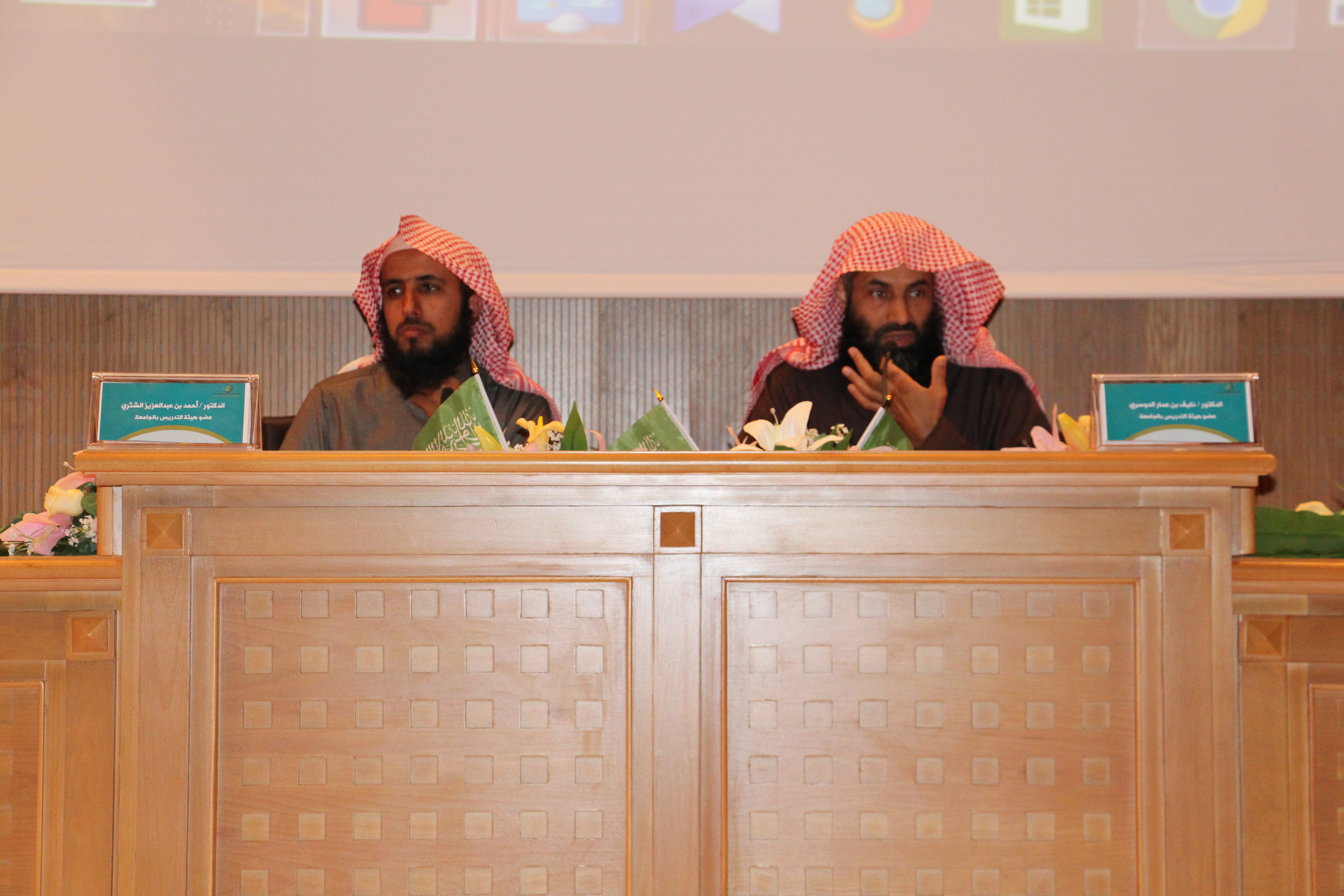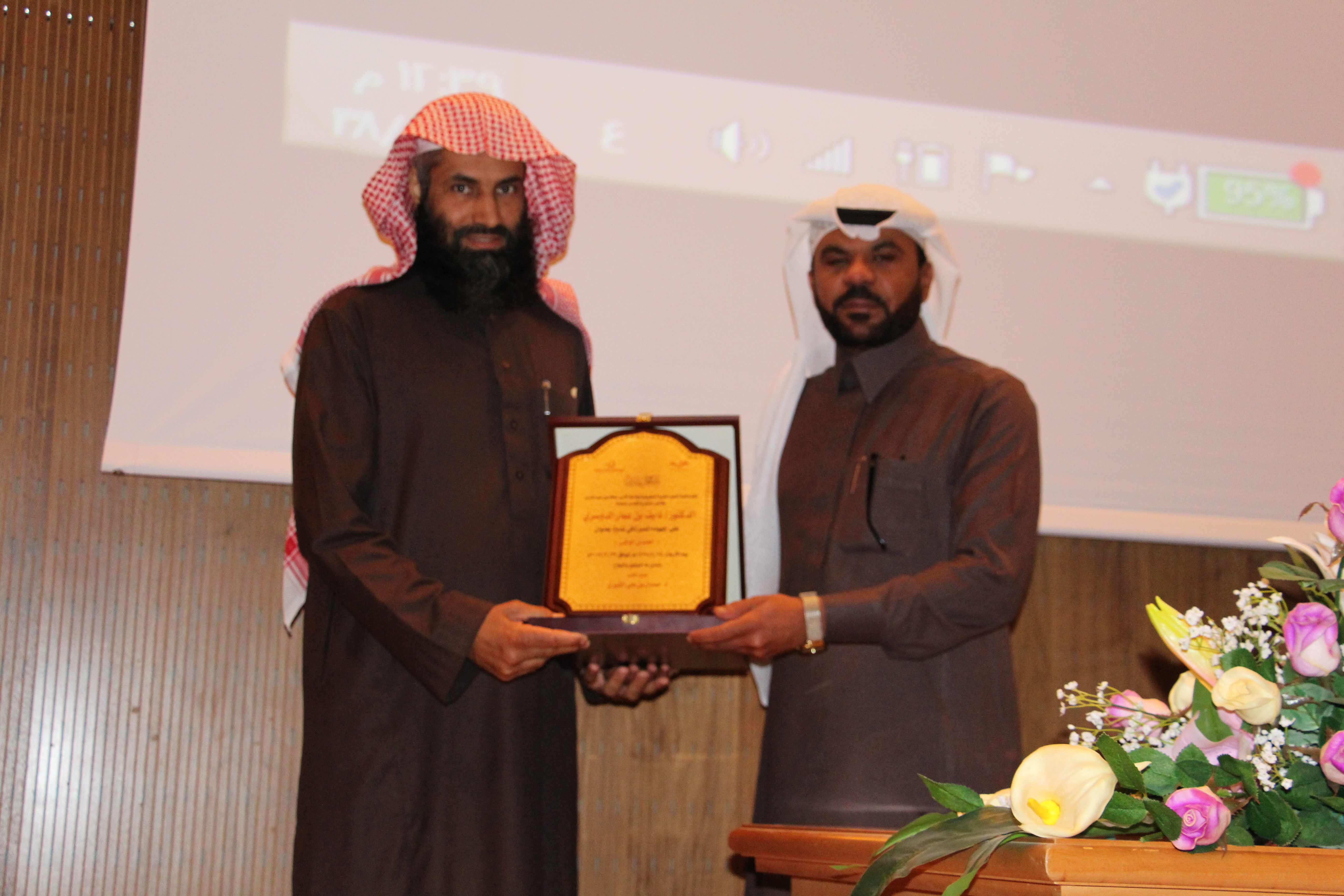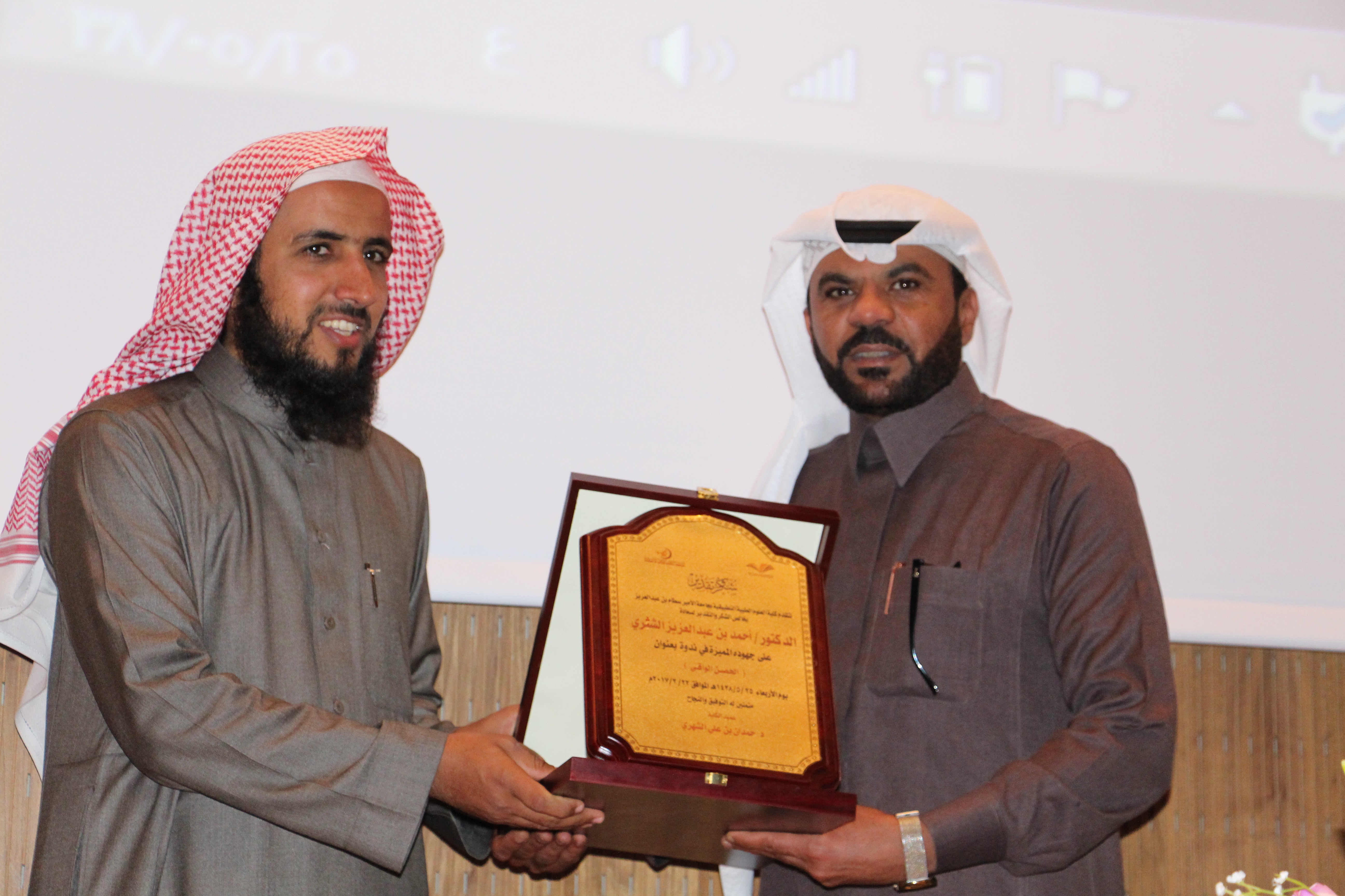 وفي نهاية الندوة كرم وكيل الكلية سعادة الدكتور/ طارق الحديدي كلا من سعادة الدكتور/ نايف بن عمار الدوسري وسعادة الدكتور/ أحمد بن عبد العزيز الشثري متمنياً لهما دوام التوفيق.