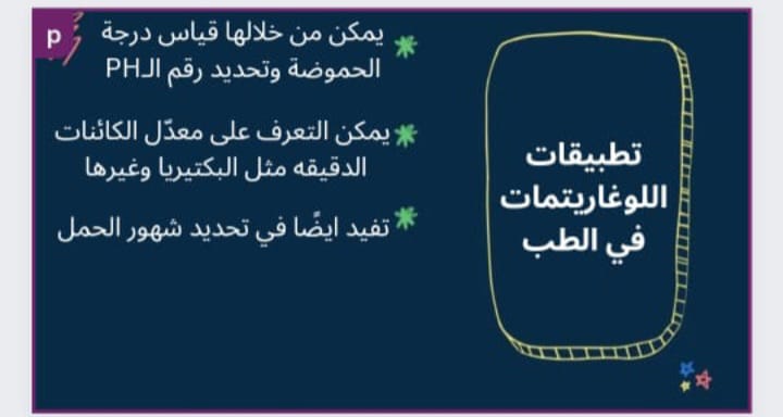 وفي بداية المحاضرة قامت احدى مجموعات المسار الصحي بتقديم هذه المحاضرة، حيث تحدثت الطالبات عن أهمية اللوغاريتمات فى حياتنا، وقد شرحت الطالبات الموضوع شرحًا مستفيضًا عن بدايه اللوغاريتمات، وتعريفها، وأنواعها، وكيفية استخدامها في حياتنا.
