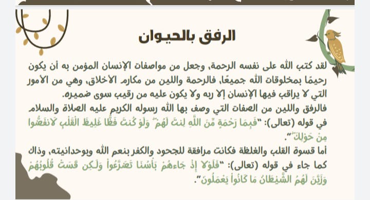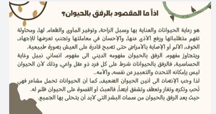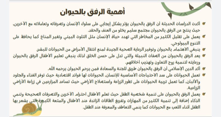 نظم نادي العلوم الأساسية بعمادة السنة التحضيرية محاضرة بعنوان "الرفق بالحيوان " قدمها طالبات صحي المستوى الثاني تحت إشراف الدكتورة اقبال احمد يوم الأحد الموافق 1443/9/16هـ، و قد اشتمل النشاط على عدة أهداف منها : إشاعة روح التراحم والإحسان للكائنات الحية في المجتمع ، التوعية بأهمية الرفق بالحيوان في جميع الجوانب الحياتية ، وإظهار ارتباطها المباشر بالقيم الإسلامية ، إيجاد حلول فيما يتعلق بالحيوانات الضالة ، والعمل على الحد من انتشارها داخل النطاق العمراني باستخدام وسائل إنسانية ،العمل مع الجهات الحكومية والخاصة ذات العلاقة ؛ لوضع حلول للصعوبات والمعوقات التي تقف في طريق الرفق بالحيوان في جميع القطاعات ، وتقديم استشارات ذات علاقة ، العمل على نشر الوعي بين الأطفال في المدارس وغيرها من المنشئات التعليمية ؛ وذلك لخلق جيل قادم واعٍ . وفي نهاية الدورة شارك الحضور في مناقشة تفاعلية تم من خلالها ذكر أمثلة مختلفة عن كيفية الرفق بالحيوان ، كما وجدت الاستحسان من الحضور لأهمية الموضوع .