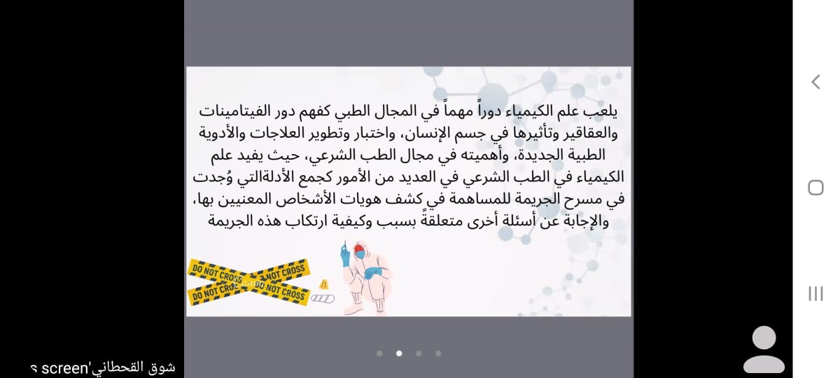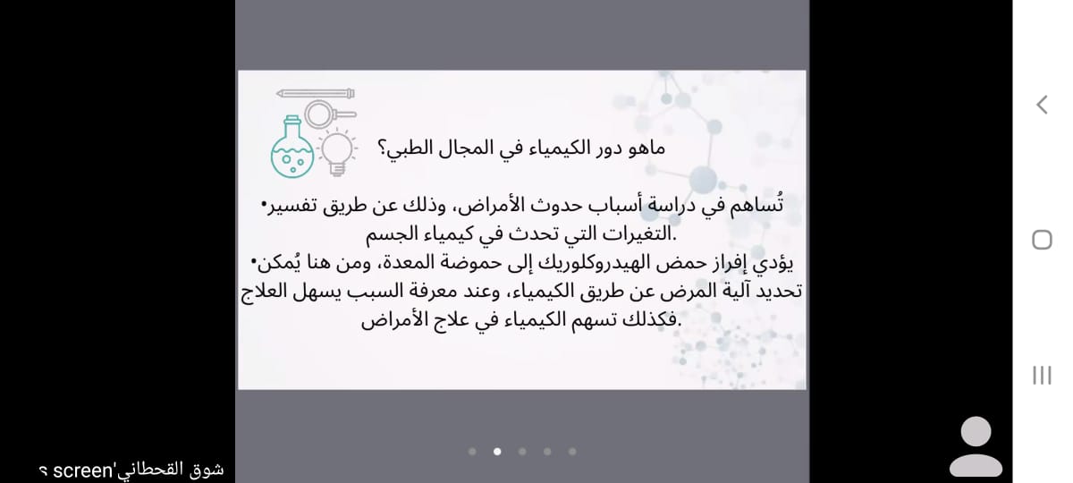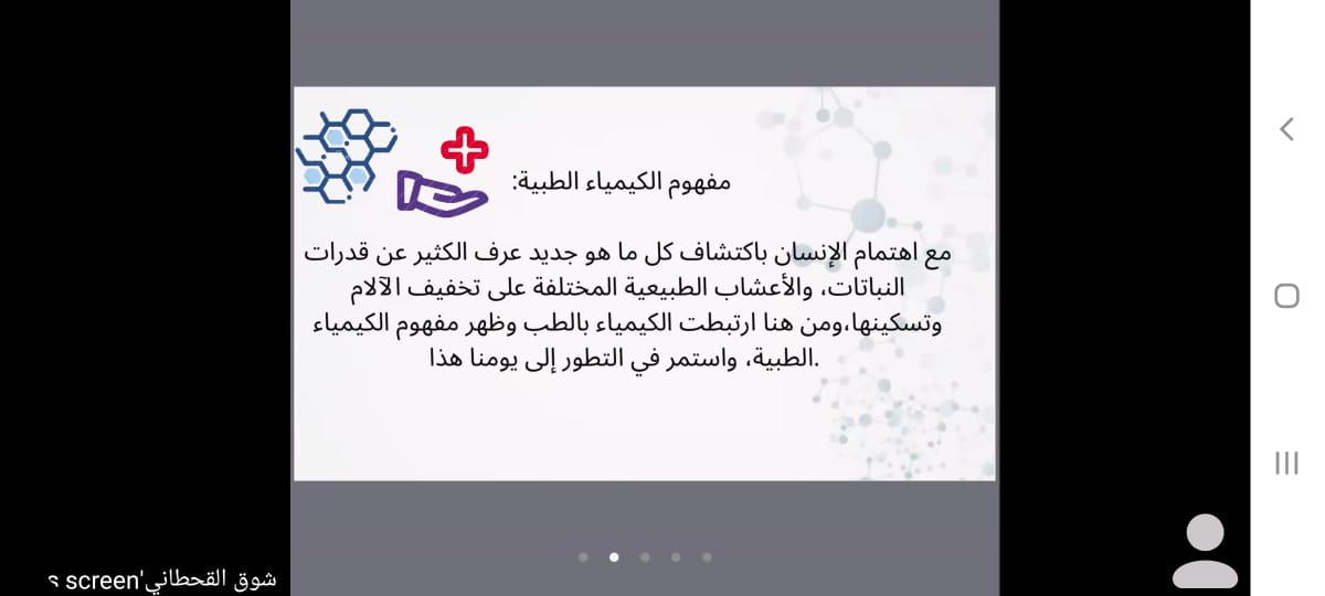 الطب والكيمياء مرتبطان ارتباطاً ببعضهما البعض ولمعرفة أهمية هذا الترابط، فقد نظم نادي عون التطوعي بعمادة السنة التحضيرية -قسم الطالبات محاضرة بعنوان (chemistry in medicine) وذلك يوم الاربعاء الموافق 1442/8/18هـ من خلال منصة برنامج zoom. حيث هدفت المحاضرة إلى التعريف بالكيمياء وارتباطها بالمجالات الطبية، و تم التطرق إلى فرع الكيمياء الصيدلانية بالأخص حيث أنها تتضح بشكل أكبر في الكيمياء العضوية الصناعية لأنها توضح ارتباط الكيمياء مع الطب، وتم توضيح المجالات المختلفة التي يتضمنها هذا المجال الكيميائي الدوائي من العلوم الطبية المختلف من البيولوجيا البنائية وعلم الانزيمات وغيرها من العلوم الطبية، حيث يعتبر العلماء المختصين بهذا المجال بكونهم علماء صناعيين يعملون مع فريق متعدد التخصصات لتصميم ادوية علاجية فعالة، كما تم توضيح تطور تسويقها، وفي نهاية المحاضرة عبر الحضور من منسوبات وطالبات العمادة عن مدى رضاهم عن المحاضرة لما تضمنته من معلومات مفيدة.