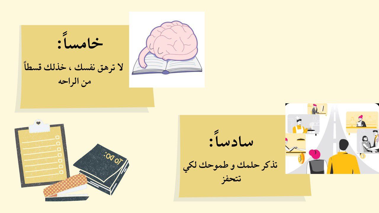 نظم المجلس الطلابي بعمادة السنة التحضيرية- قسم الطالبات محاضرة بعنوان (كيفية المذاكرة الصحيحة) من تقديم طالبة المجلس: لينا سعود العنزي ، وبإشراف الأستاذة سهاد الهويدي، وذلك يوم الخميس الموافق 1443/7/30هـ، بدأت الطالبة لينا العنزي عرض المحاضرة بترحيب الحضور، ثم بتقديم سريع عن المذاكرة وأنواعها، وكيفية التعامل مع المواد المختلفة لمذاكرتها واستعراض كيفية التعامل معها كل بحسب طبيعته، فالموضوع العلمي و التجريبي تختلف مذاكرته وطرق التعامل معه عن الموضوع النصي أو اللغوي أو حتى الديني والأدبي. كما ذكرت الطالبة أهم خطوات المذاكرة الصحيحة ، وماهي الطرق الصحيحة والسريعة للمذاكرة لتعم الفائدة بين طالبات العمادة، ثم تلتها أهمية ترتيب مكان الدراسة وأهمية أخذ قسط من الراحة وطرق مقاومة النسيان. واختتمت المحاضرة بعبارات الثناء والتقدير من الحضور لأعضاء المجلس الطلابي على ما تم تقديمه في هذه المحاضرة.