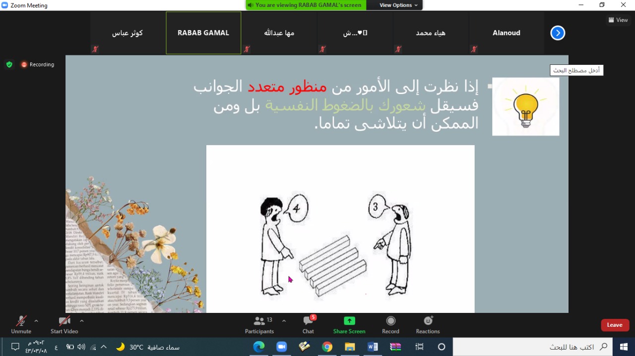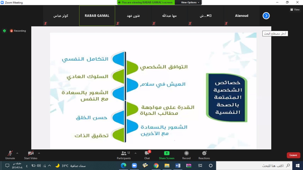 تحت رعاية عميد كلية العلوم والدراسات الإنسانية الدكتور فيصل بن شبيب ووكيلة الكلية الدكتورة عواطف نصار الرشيدي أقامت وحدة الارشاد الأكاديمي متمثلة بمحور التوجيه والإرشاد النفسي والاجتماعي يوم الخميس الموافق 8/3/1443 محاضرة تثقيفية توعوية بمناسبة اليوم العالمي للصحة النفسية بعنوان لا سعادة بدون صحة نفسية جيدة لمدة ساعتان عبر الزووم قدمتها / رباب جمال عبد الحميد مشرفة وحدة الارشاد الأكاديمي قسم الدراسات الإسلامية.
