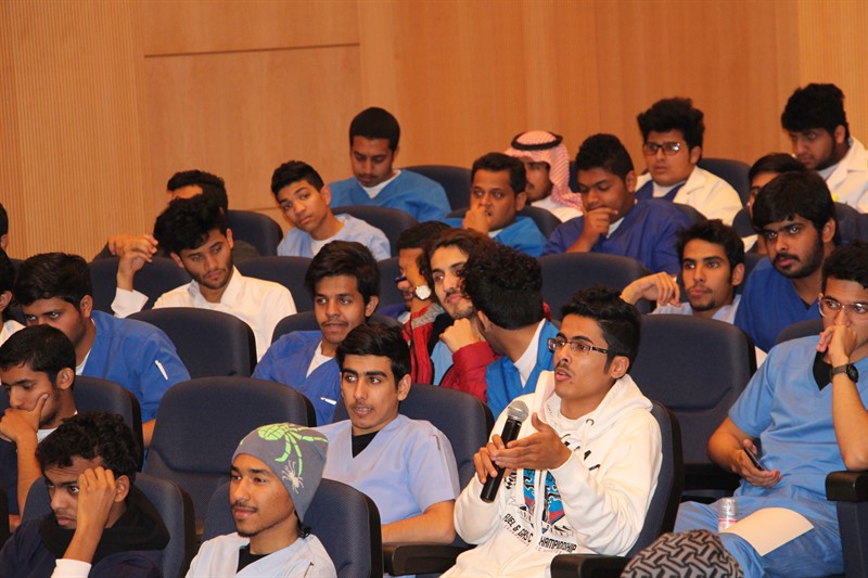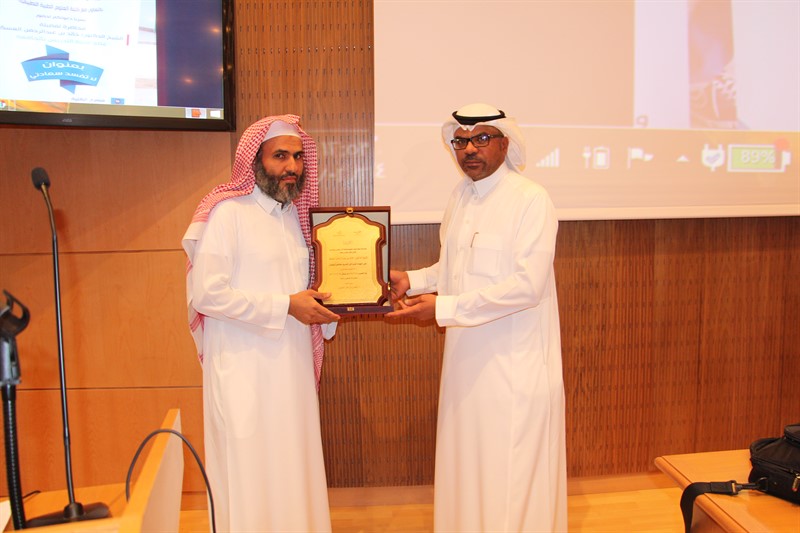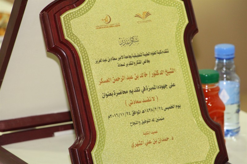وقد استهل سعادة الشيخ الدكتور/ خالد العسكر محاضرته بالحديث عن السعادة وكثرة طلابها وأنها تأتي بالتمسك بكتاب الله وسنة نبيه صلى الله عليه وسلم. وشدد ايضاً على أهمية اختيار الصديق الصالح وأثره على صاحبه , كما حذر من الإنسياق وراء الدعوات المشبوهة والضالة التي تحاول إفساد شباب المسلمين. وقد شهدت المحاضرة تفاعلاً مميزاً من الحضور من طلاب وأعضاء هيئة التدريس, عقبها تم تكريم سعادة الدكتور / خالد العسكر من قبل سعادة وكيل الكلية الدكتور/ طارق الحديدي شاكراً ومقدراً مشاركته الفعالة في انجاح مشروع "نحو جامعة واعية-1" والذي تشرف عليه وكالة الجامعة للشؤون التعليمية والأكاديمية.