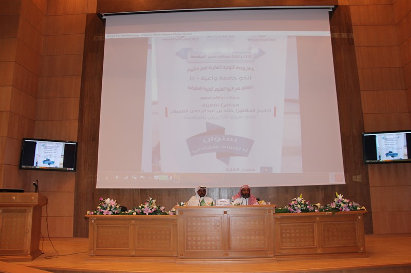 بتوجيه من عميد الكلية سعادة الدكتور/ حمدان بن علي الشهري, رعى وكيل الكلية سعادة الدكتور/ طارق الحديدي محاضرة بعنوان (لا تفسد سعادتي), والتي ألقاها سعادة الشيخ الدكتور/ خالد بن عبدالرحمن العسكر بمسرح الكلية كلية العلوم الطبية التطبيقية , تأتي هذه المحاضرة في إطار مشروع (نحو جامعة واعية-1) بإشراف وحدة التوعية الفكرية بالجامعة.