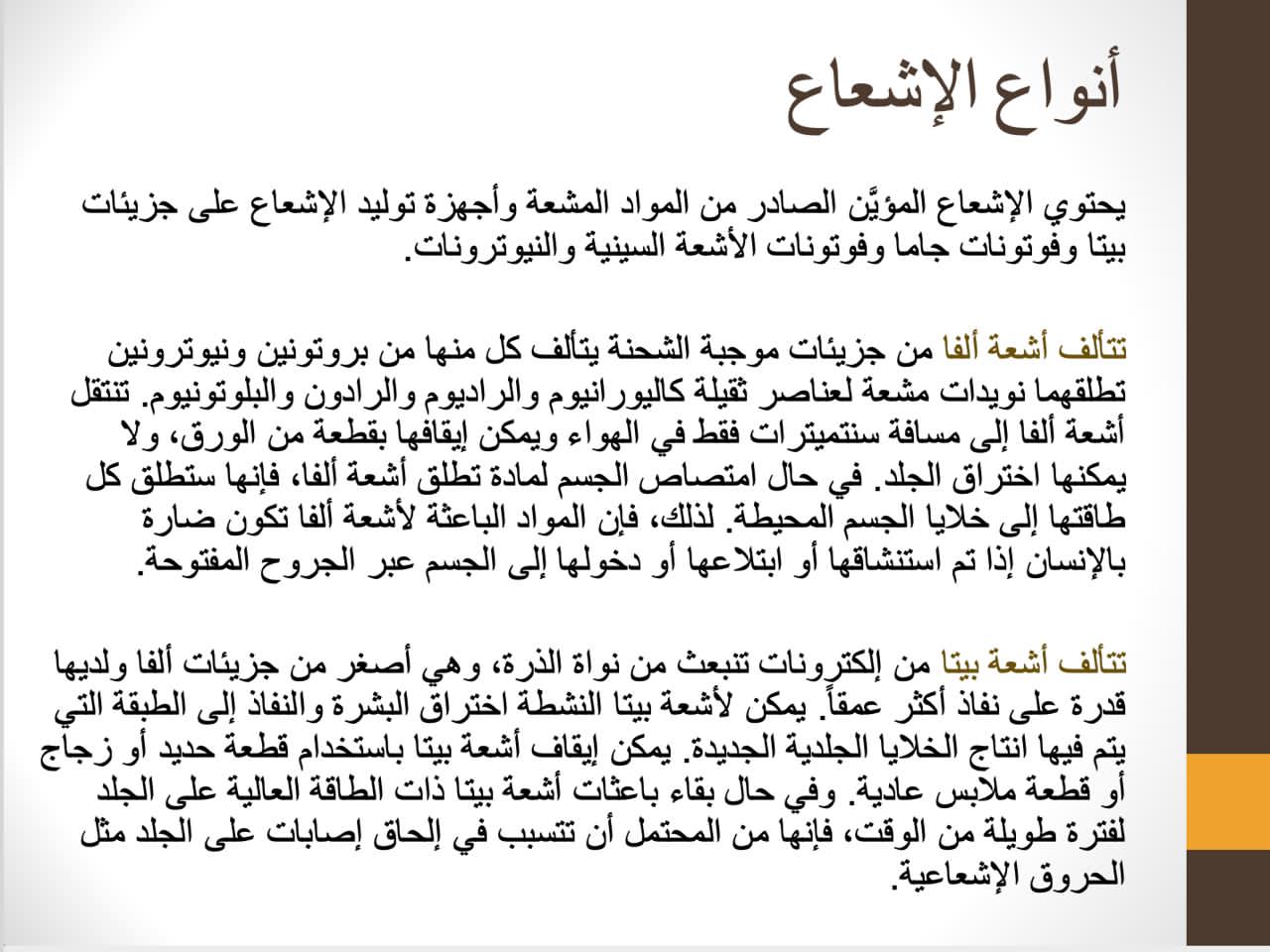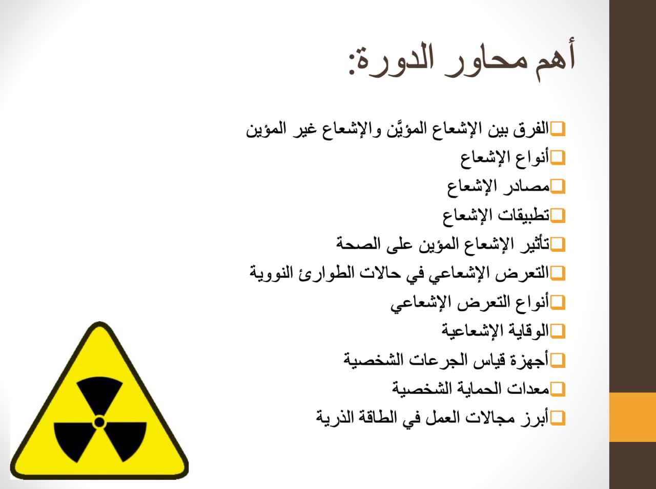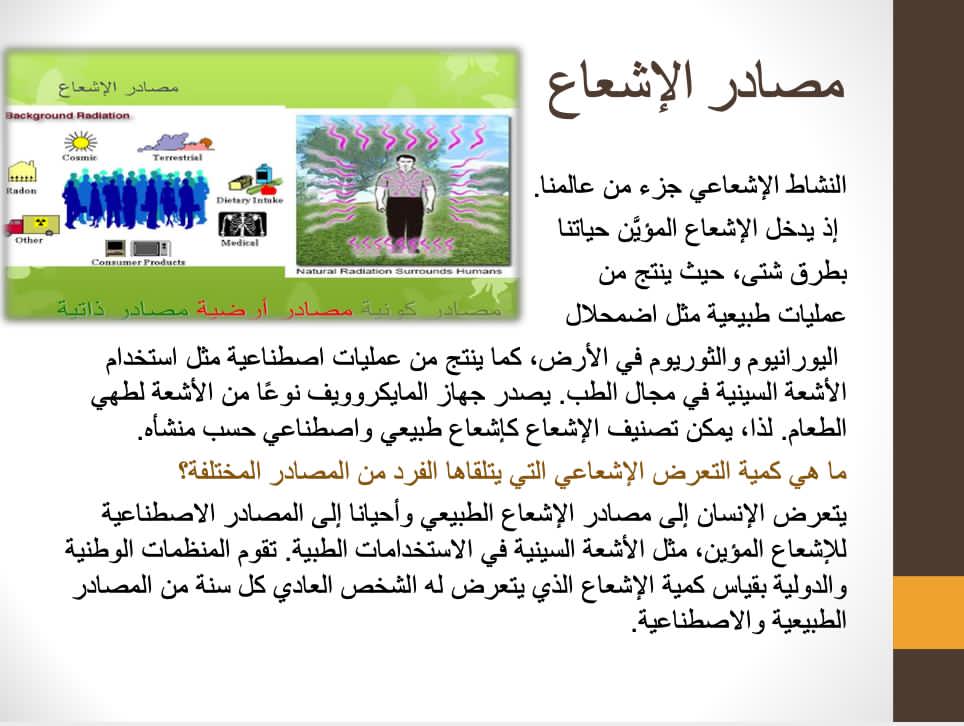 وقد هدفت المحاضرة الى إعطاء الطالبة فكرة عن مفهوم الاشعاع وعن أهم مصادر الاشعاع وتطبيقاتها وعن اهم طرق الوقاية من الاشعاع.