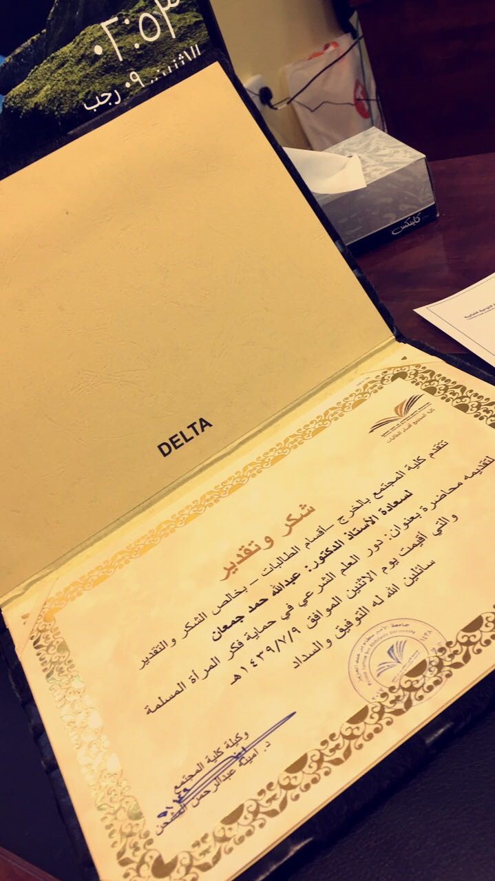 تحت رعاية سعادة الدكتورة / أمينة بنت عبد الرحمن المشحن وكيلة كلية المجتمع بالخرج –أقسام الطالبات – وبالتعاون مع وحدة التوعية الفكرية ضمن مشروع نحو-جامعة واعية 2-نظمت الكلية يوم الأثنين الموافق 9/7/1439هـ في تمام الساعة العاشرة صباحاً محاضرة لسعادة الأستاذ الدكتور /عبد الله بن حمد الجمعان بعنوان " دور العلم الشرعي في حماية فكر المرأة المسلمة "
