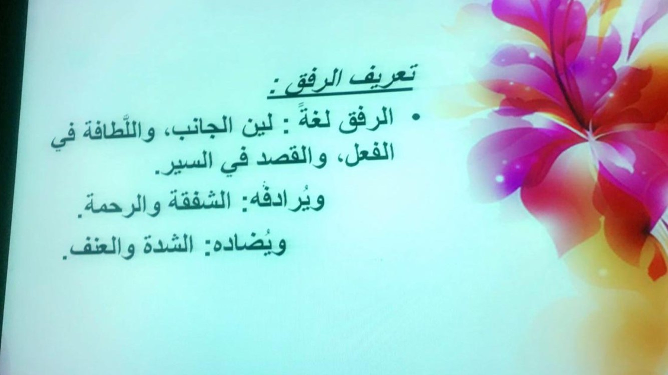 لا تكاد ساحة من ساحات الإسلام إلا وللرفق فيها النصيب الأكبر والحظ الأوفر، سواء على مستوى التشريع الفقهي أو في جانب العلاقات الاجتماعية أو في المعاملة حتى مع الخصوم والأعداء أو في غيرها من المواطن، هذا فضلا عن أنه تعالى عرف نفسه لعباده بأنه الرفيق الذي يحب الرفق، وكان رسوله -صلى الله عليه وسلم- نبراسا في هذا الشأن ما لم تنتهك حرمة من حرمات الله من هذا المنطلق قدم نادي شغف محاضرة (خلق الرفق) للدكتورة.ايمان الريح الأستاذ مساعد بقسم دراسات الاسلاميةبكلية التربية الخرج,يوم الثلاثاء 21-02– 1440هـ تحت اشراف وحدة العمل الطلابي,وتهدف الدورة للتعريف بالرفق وأهميته وأهدافه فى الحياة وتذكير الطالبة بالجانب الاخلاقى ويأتى فى مقدمتها الرفق وهو اللين فى المعاملة والتفكير والتلاحق والتشاور فى مفاهيم مهمة مثل الرفق فهى راس الحكمة.
