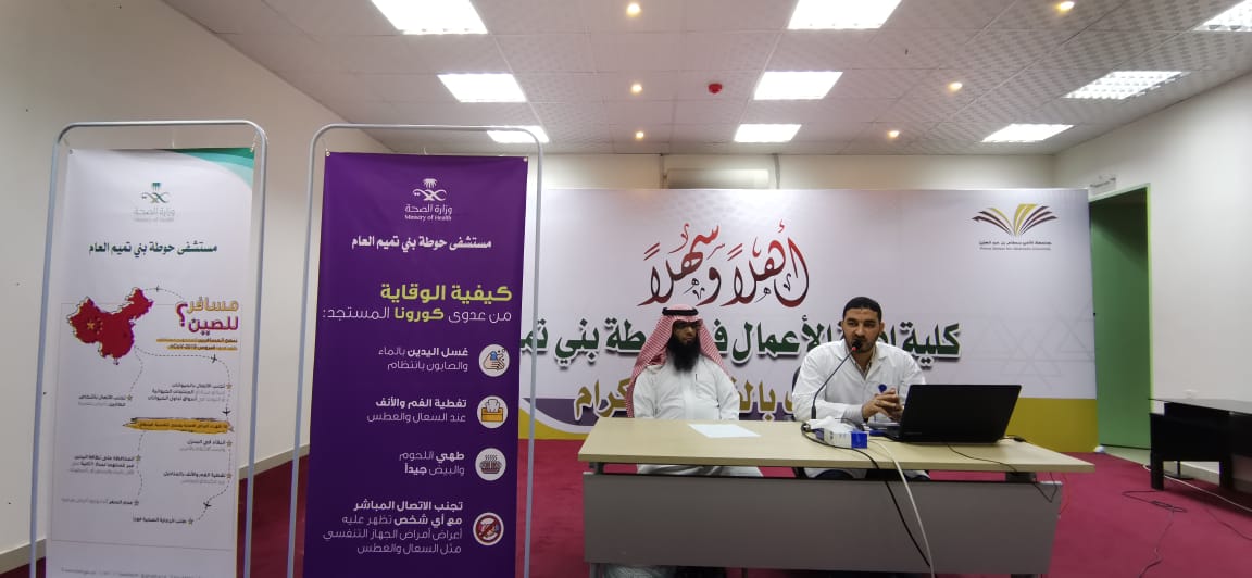 نظم نادي الريادة والإبداع في كلية إدارة الأعمال بحوطة بني تميم محاضرة طبية، تحت عنوان: (كورونا الحقيقة والوقاية)، قدمها د. إيهاب عبدالفتاح إسماعيل أخصائي الأطفال حديثي الولادة ومكافحة العدوى في مستشفى حوطة بني تميم العام، وذلك في يوم الأربعاء ١٤٤١/٦/٢٥هـ.