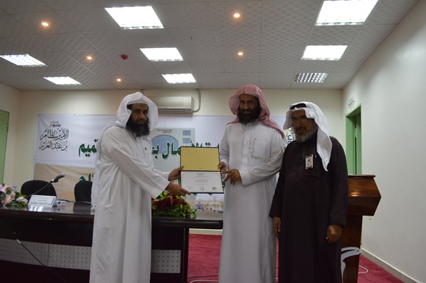 وفي الختام قدم وكيل الكلية للشؤون التعليمية والأكاديمية د. إبراهيم بن محمد الداود، ومدير إدارة الكلية أ. إبراهيم بن مرشد المهنا شهادة شكر وتقدير للدكتور نايف الدوسري.