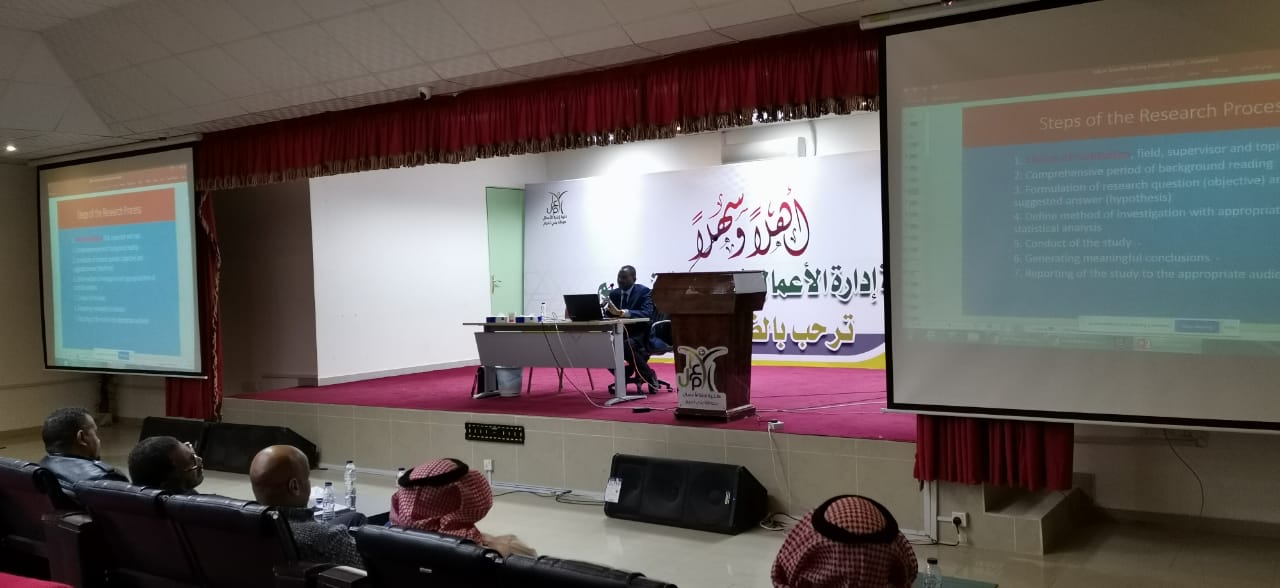 نظمت كلية إدارة الأعمال في حوطة بني تميم ممثلة بوكالة الكلية للدراسات العليا والبحث العلمي والجودة محاضرة تستهدف أعضاء هيئة التدريس، تحت عنوان: (صياغة مقترح رسالة الدكتوراة)، قدمها المستشار في وكالة الجامعة للتطوير والجودة أ.د. عبدالمنعم آدم محمد سليمان، وذلك في يوم الاثنين ١٤٤١/٦/٩هـ.