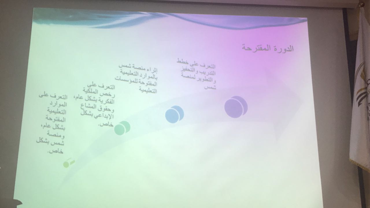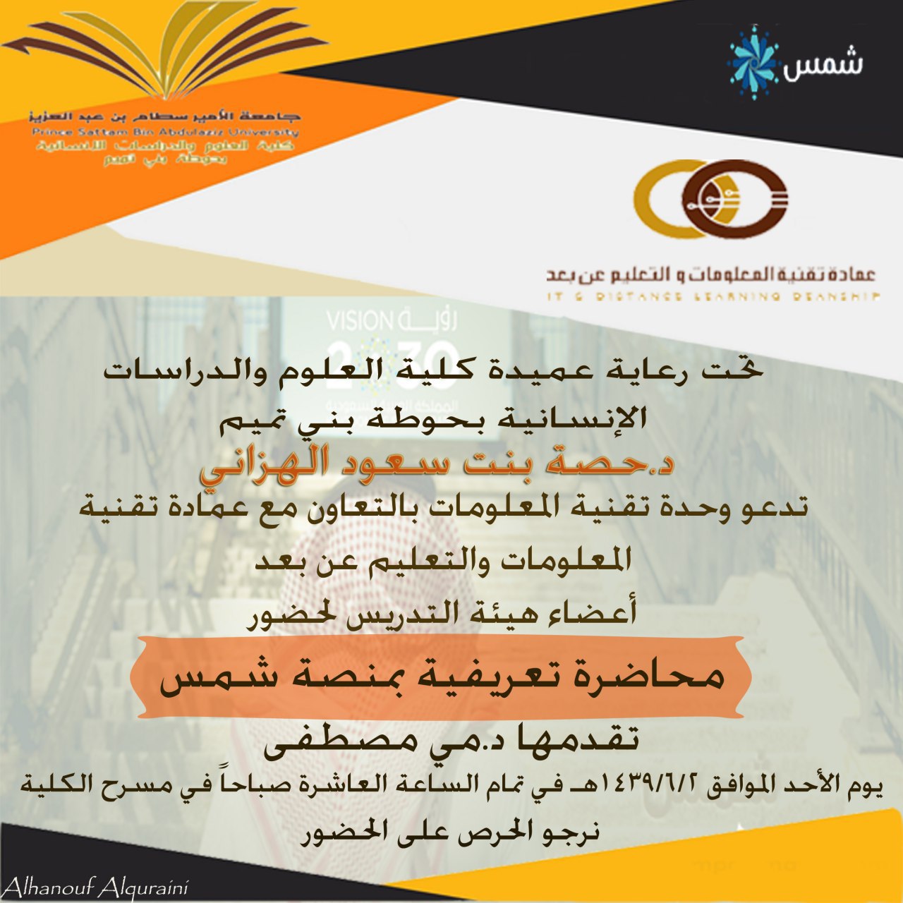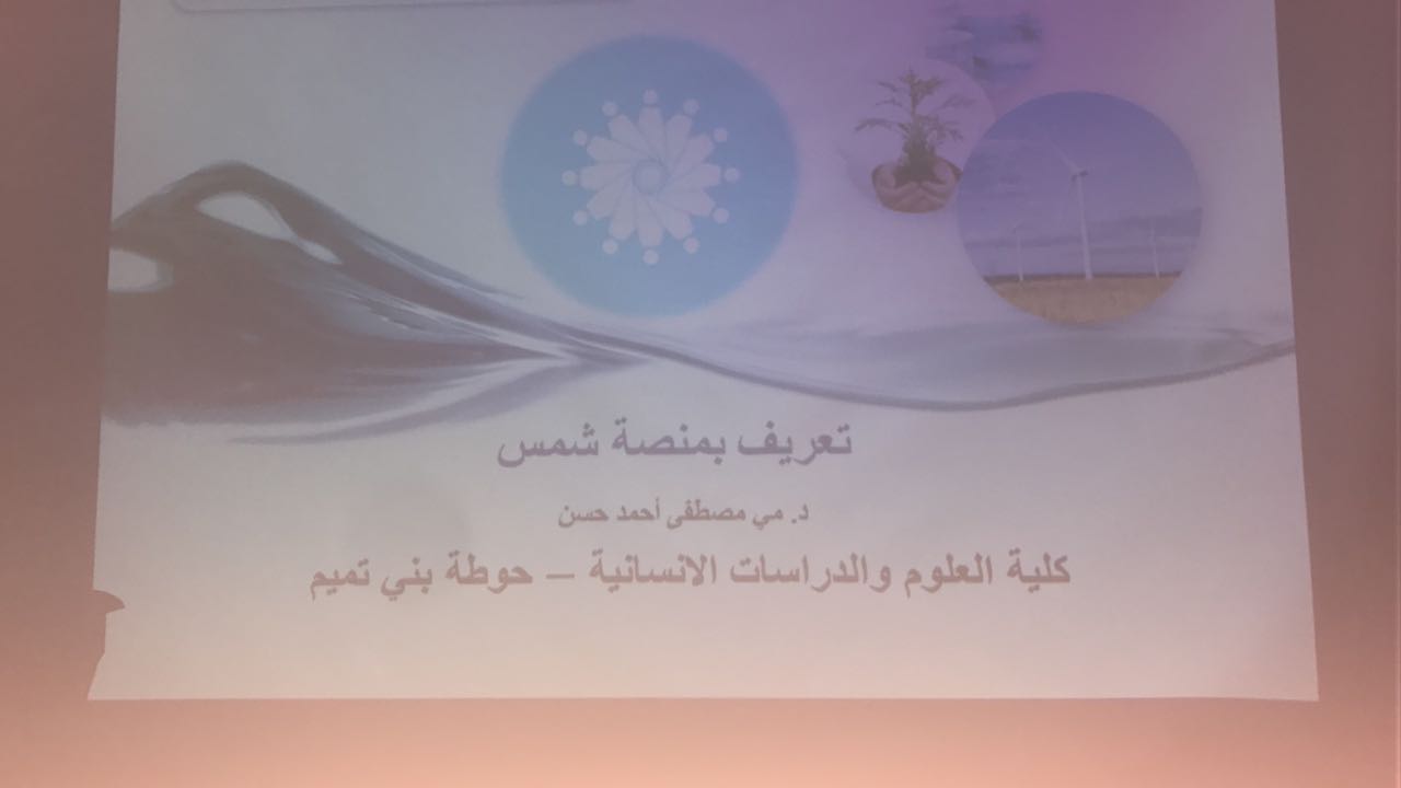 تحت رعاية عميدة كلية العلوم والدراسات الانسانية بحوطة بني تميم أقامت وحدة تقنية المعلومات بالتعاون مع عمادة تقنية المعلومات والتعليم عن بعد محاضرة تعريفية بمنصة شمس يوم الأحد 2 / 6 / 1439 هـ من تقديم الدكتورة مي مصطفى. كانت المحاضرة موجهة لأعضاء هيئة التدريس حيث تم فتح باب التسجيل لحضور دورة منصة شمس لمدة يومين. تطرقت الدكتورة مي خلال المحاضرة إلى عدة محاور شملت التعريف بمنصة شمس وشرح مختصر لأهميتها ومميزاتها كمنصة مهمة للموارد التعليمية السعودية المفتوحة وكيفية الاشتراك بها وجائزة التمييز بالتعليم الالكتروني.