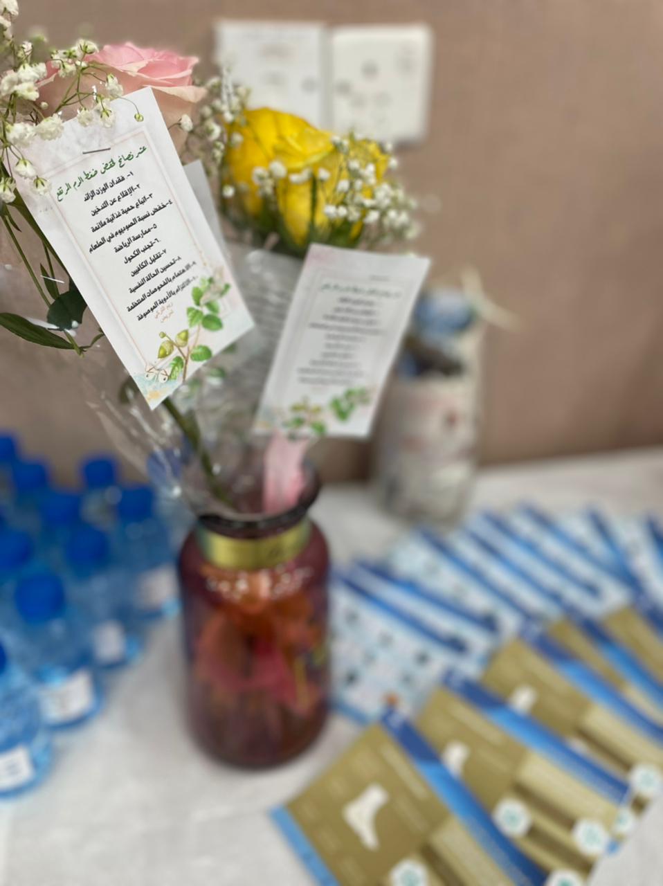 حيث قدمت الدكتورة / أميرات السبيلي محاضرة عن الامراض المزمنة الضغط و السكري و التعريف به و اعراضه و مضاعفاته , ووجود ركن توعي بتوزيعات صحية و مفيدة لمرض السكري و منشورات توعوية .