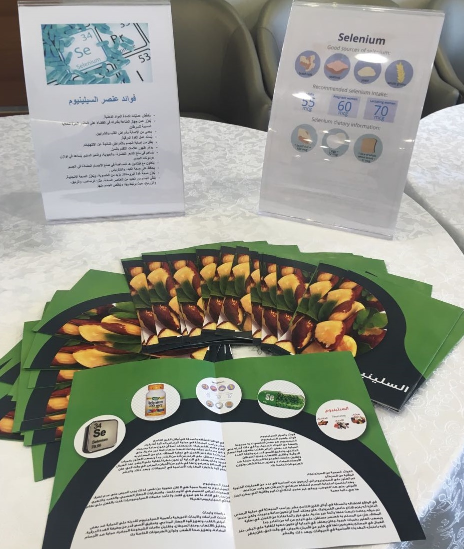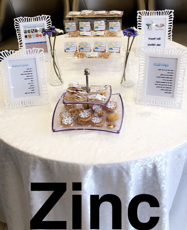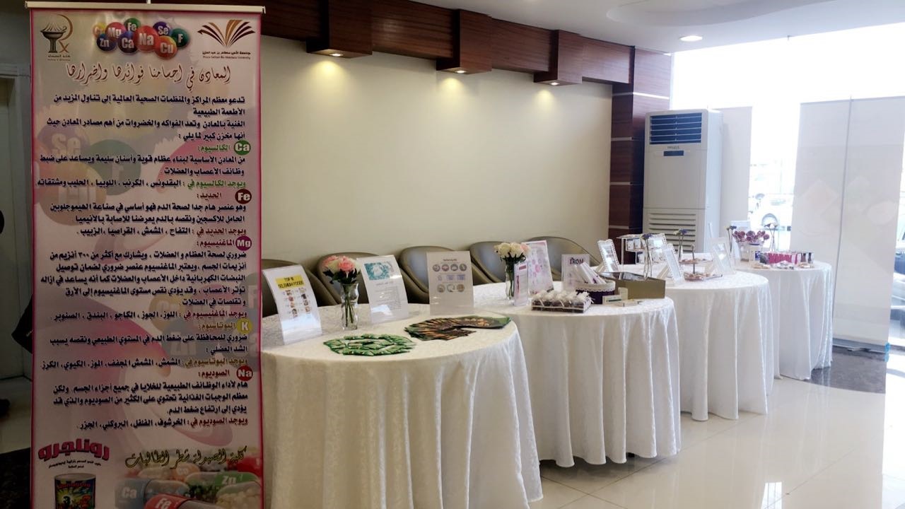 تفعيلاً لدور خدمة المجتمع قامت مجموعة من طالبات كلية الصيدلة بعمل فعالية تثقيفية عن المعادن الضرورية التي يحتاجها الجسم وذلك يوم الثلاثاء الموافق ٢١/ ٣ / ١٤٣٨ه بمجمع عيادات طبيبك بالخرج بهدف التوعية بأهمية المعادن لوظائف أعضاء الجسم وأنسجته حيث تم عمل ركن تعريفي للمعادن الطبيعية وفوائدها و قيمتها العلاجية كالزنك والكروم واليود وغيرها حيث تم تثقيف الزوار والمراجعين بأهمية المعادن للجسم وشرح علاقة نقصها وزيادتها ببعض الأمراض الشائعة والتأكيد على أخذ الأحتياج الكافي وعلاقته بالأمراض وتعارضاته الدوائية المختلفة وتم عرض أغلب المصادر الغذائية التي تحوي هذه المعادن وتخلله توزيع عينات ونشرات توضحية للحضور ،يذكر أن الفعالية من تنفيذ وإعداد الطالبات : ملاك المقحم ، سارة الخالدي ، عهد القحطاني أمل المرداس . تهاني العتيبي- نورة الصويغ- مريم الحراجين + ابتسام العواجي