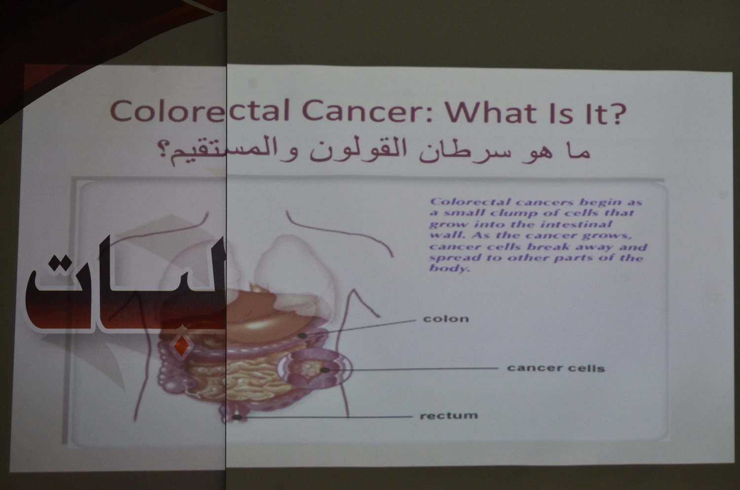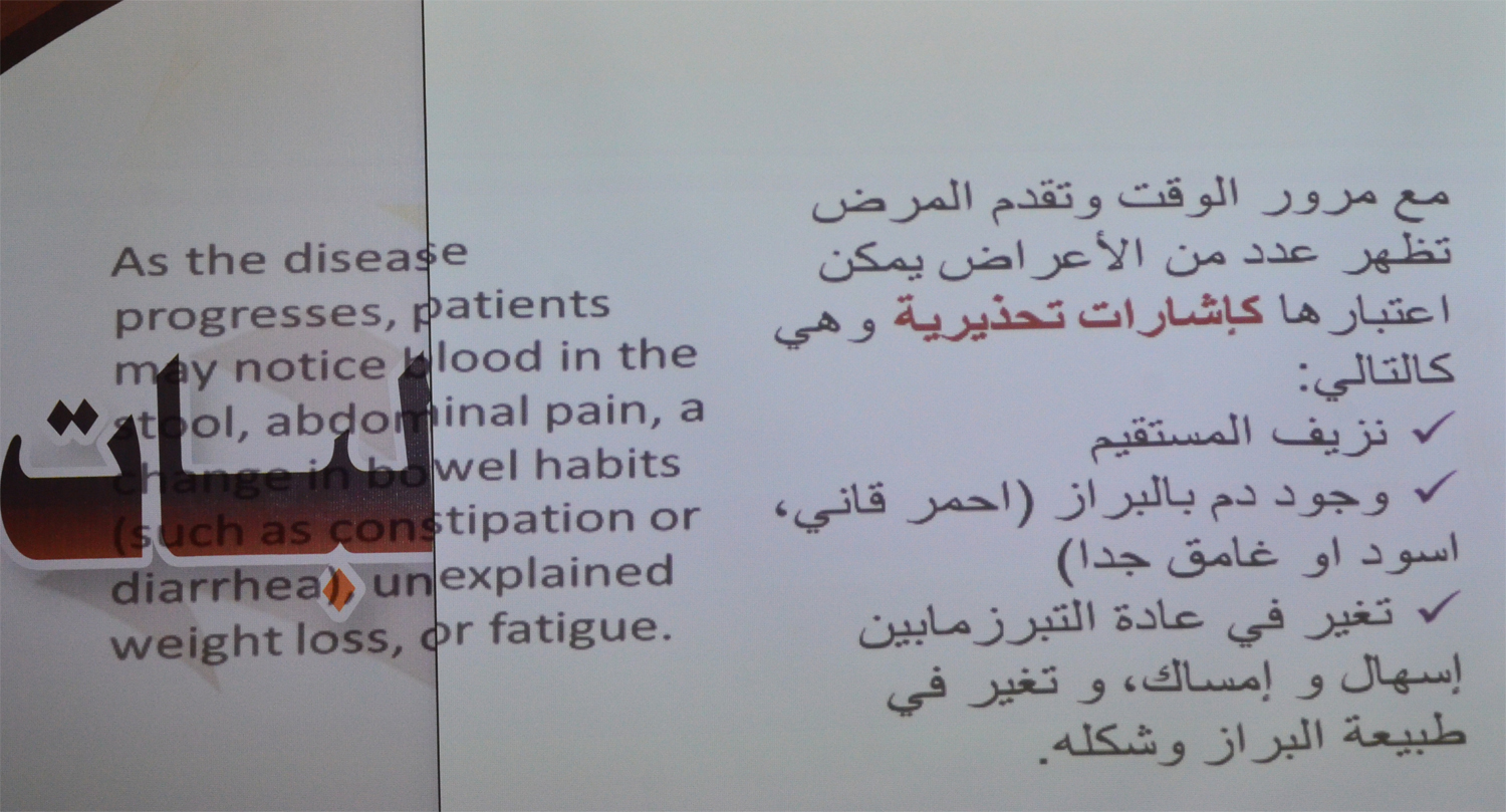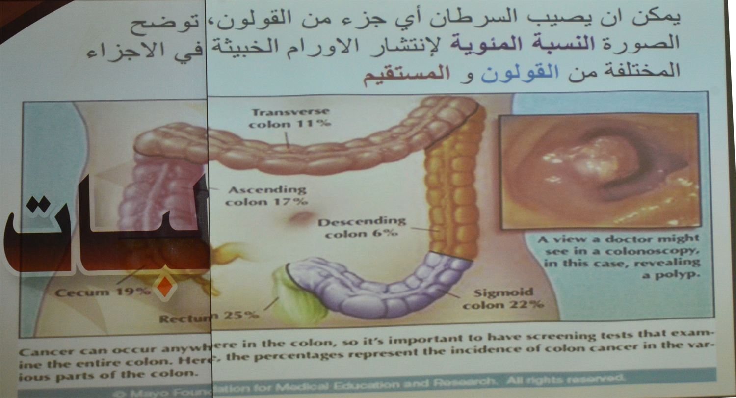نظمت وحدة العمل الطلابي متمثلة في البرامج الثقافية و الاجتماعية بكلية العلوم والدراسات الإنسانية بالأفلاج ( شطر الطالبات ) يوم الأربعاء 1440/7/20 هـ الساعة العاشرة صباحاً في مسرح الكلية بالشراكة المجتمعية مع مجمع القارة الطبي محاضرة توعوية عن ( سرطان القولون ) قدمتها الدكتورة هناء عبدالله , افتتحتها بالتعريف بالمرض ومسبباته و من هم الأكثر عرضة للإصابة به , بعدها ذكرت العوامل التي تؤدي إلى تكوّن هذا المرض و العلامات التحذيرية للإصابة به , تلاها الخطوات التي يتم إتباعها للكشف المبكر عنه , ثم ذكرت طريقة علاجه و طرق الوقاية منه , حيث تهدف المحاضرة إلى رفع الوعي الثقافي بهذا المرض للوقاية منه - بإذن الله - .