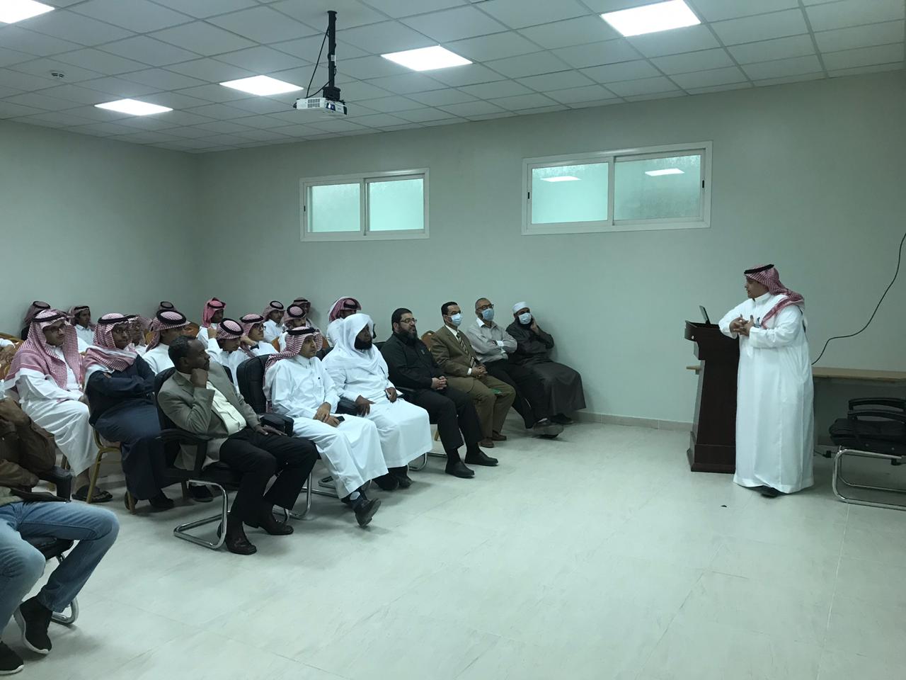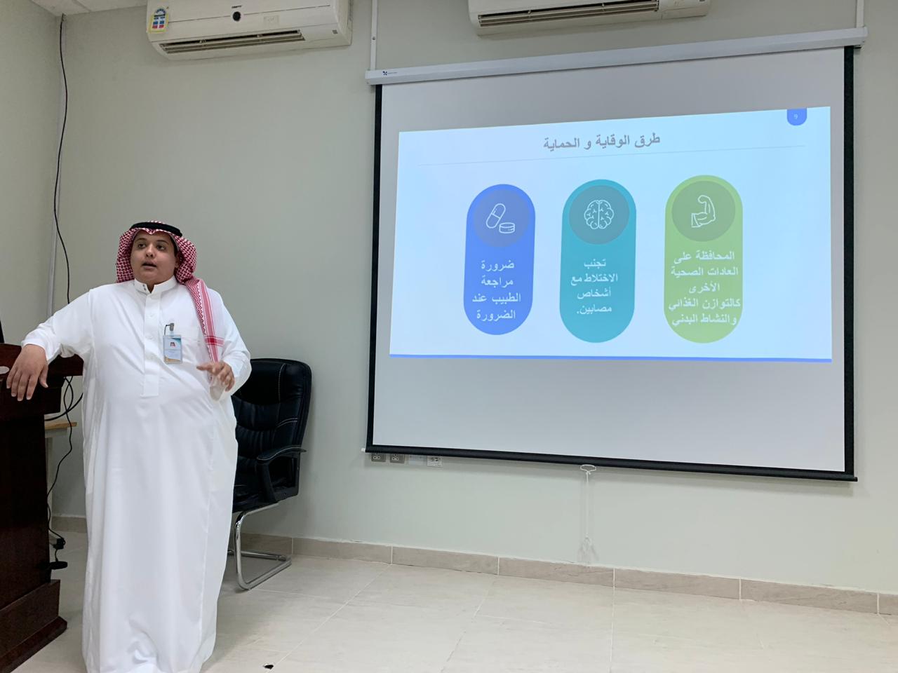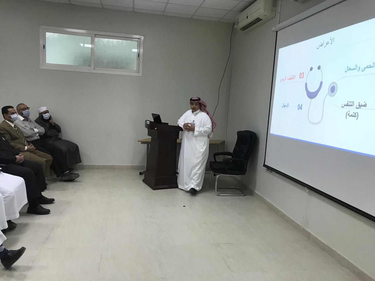 وقدم المطيري عرضًا مرئيًّا استعرض من خلاله (التعريف بالمرض ومسبباته، وطرق و آلية انتشار المرض، الخطوات المتبعة في التشخيص ، والإرشادات الوقائية التي تحد من الإصابة وانتقال المرض بإذن الله).