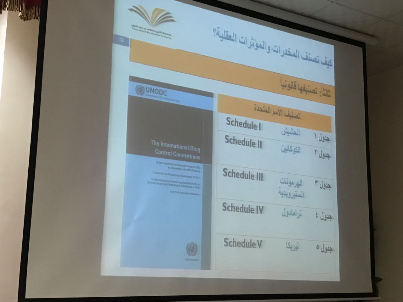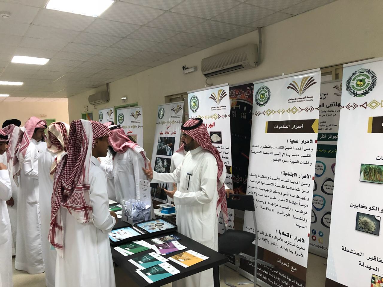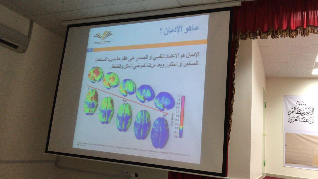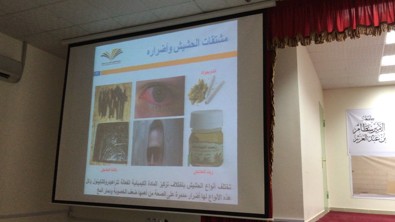وقد ألقى سعادة الدكتور/ محمد بن حسين القيسي (عضو اللجنة التوعوية لمكافحة المخدرات بالجامعة) محاضرة تثقيفية عن أضرار المخدرات، احتوت على التعريف بالمخدرات وأنواعها المختلفة المنتشرة عالمياً، حيث ذكر أن هناك أنواعاً تنتشر في بعض البلدان أو القارات وتقل في غيرها، كما فصل في محاضرته أضرار بعض المواد المخدر كالحشيش والهيروين والكوكايين والأفيون وغيرها، وحذر الطلاب والحضور من استخدام مثل هذه المواد المحظورة لما لها من الآثار الخطيرة جداً على صحة الإنسان وعقله، وتأثيرها بعد ذلك على حياته الاجتماعية وعلاقاته مع الناس.