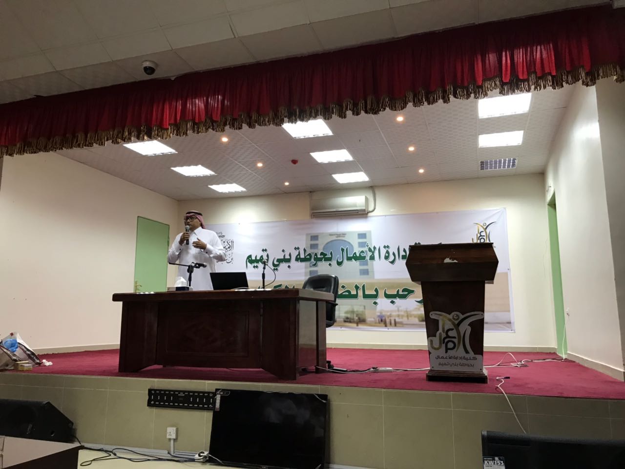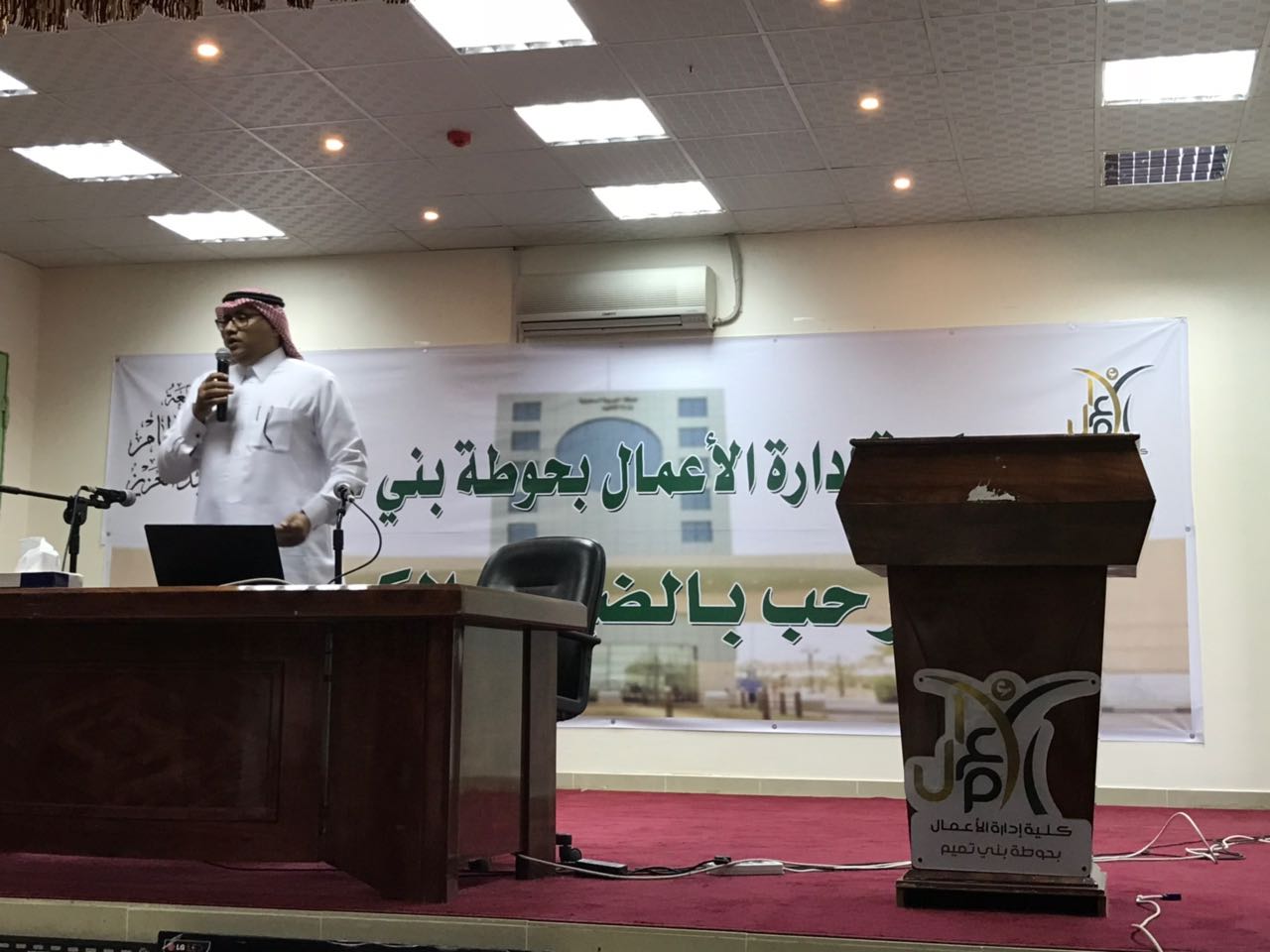 وكان في استقبال اللجنة والوفد المساند لها سعادة وكيل كلية إدارة الأعمال للشؤون التعليمية بالحوطة الدكتور/ إبراهيم بن محمد الداوود، وكذلك سعادة الأستاذ/ فهد بن علي العبودي مشرف الأنشطة الثقافية والاجتماعية بالكلية، والذي ساند في إقامة البرنامج، وتسهيل كافة مرافق الكلية لتنفيذه.
