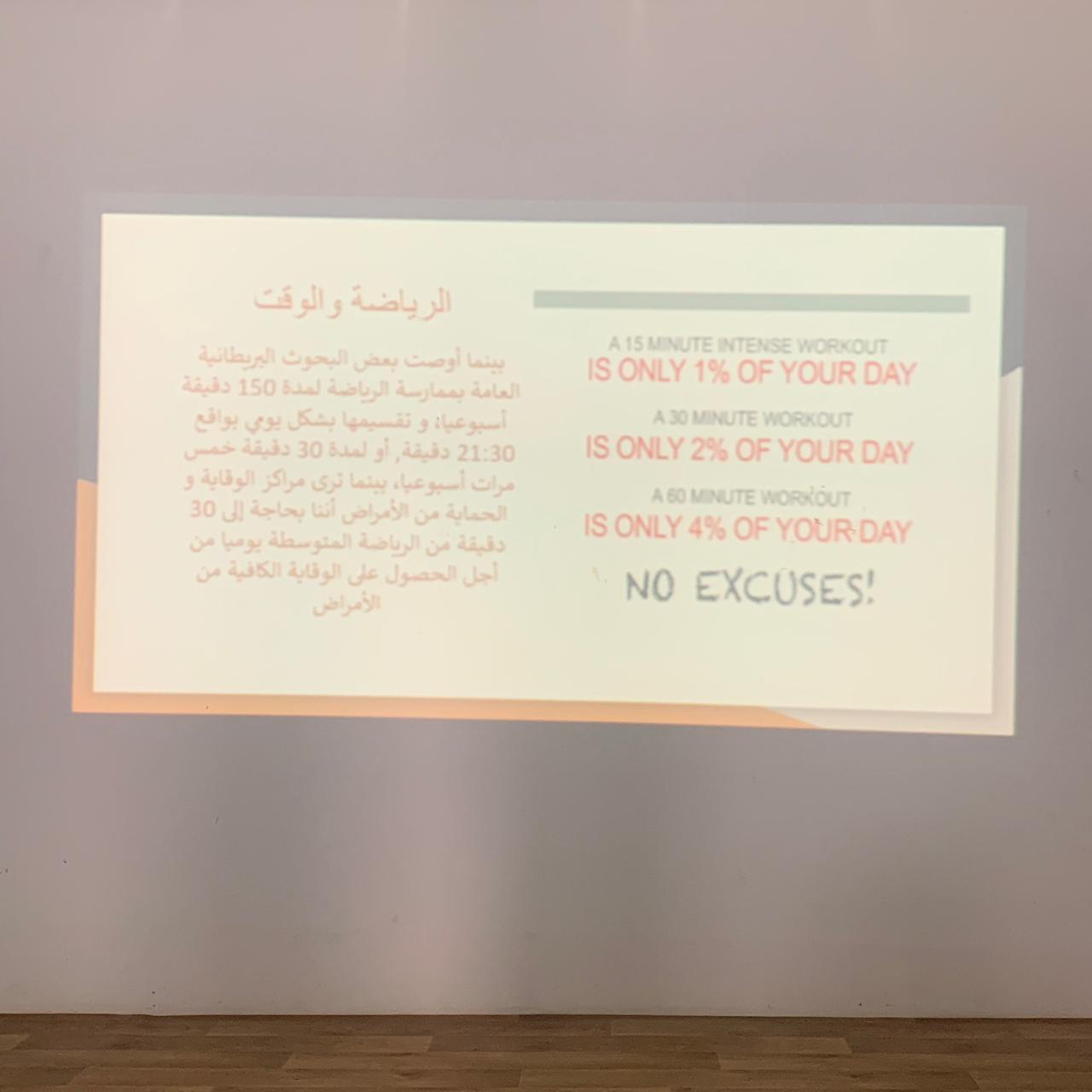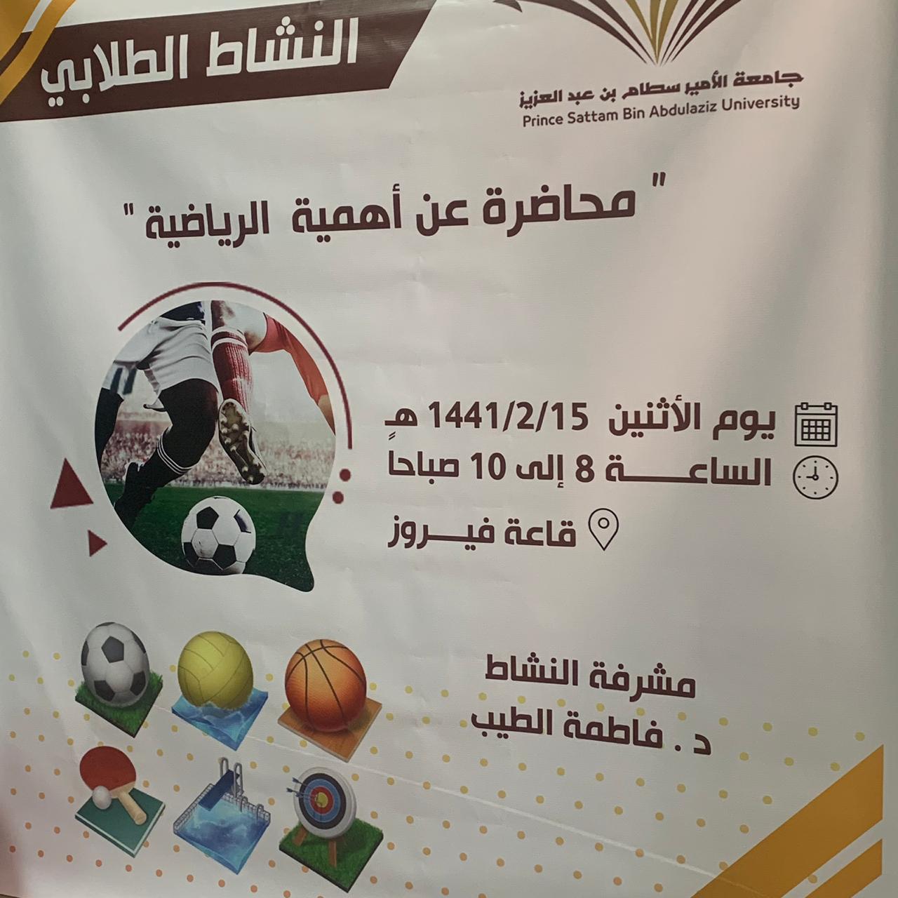أقام النشاط الرياضي بالكلية بالتعاون مع وحدة العمل الطلابي محاضرة بعنوان (أهمية الرياضة) يوم الأثنبن الموافق 15- 2 – 1441هـ.بقيادة د.فاطمة عبدالرحمن الطيب الأستاذ مساعد بقسم علم النفس بالكلية. وتهدف الدورة لتعريف الطالبات بأهمية الرياضة والتى تساعد على المتعة وتطوير الذات والثقة بالنفس . ممارسة مهارات بمجهود بدنى بغرض الترفيه,و التخلص من الروتين وقضاء اوقات الفراغ بغرض المتعة ,و تعطي ثقة وتغضى على التفكير السلبي,و الحد من احتمال الاصابة بالإمراض النفسية المتنوعة وعلى سبيل المثال الاكتئاب .وحضر الفعالية 45 طالبة.