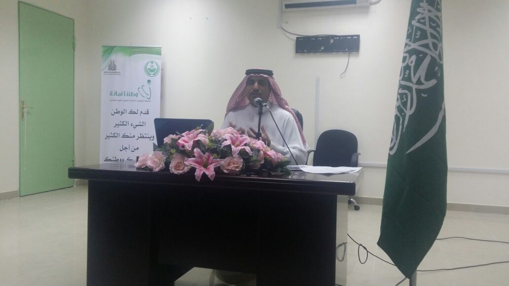عقبها ألقى وكيل الكلية الدكتور عيد بن شريدة العنزي محاضرة بعنوان "اليوم الوطني مفاهيم ومضامين" عن اليوم الوطني بيّن فيه معنى المواطنة، وبعض الظواهر السيئة أثناء الاحتفال من بعض الشباب مثل التفحيط وغيرها، ونبه إلى خطورة بعض المواقع الالكترونية التي تستهدف تفريق أبناء هذا البلد العريق.