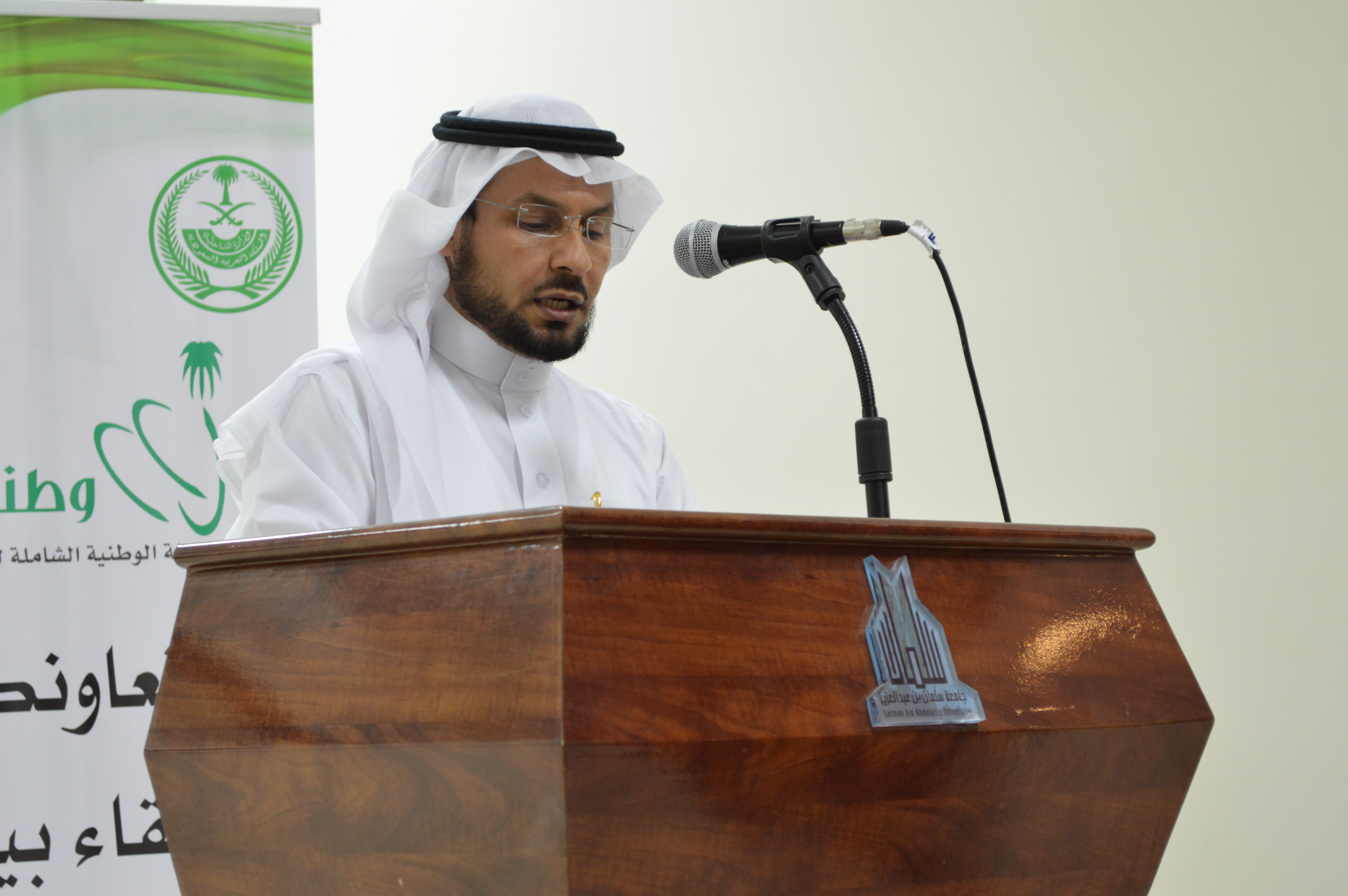 بعد ذلك توجه المحافظ والحضور إلى مقر الحفل الخطابي المعد في مسرح الكلية، حيث بدأ الحفل بآيات عطره من كتاب الله الكريم ثم كلمة لعميد الكلية الدكتور خالد العتيبي تحدث فيها عن أهمية اليوم الوطني وأنه يوم أصبح نموذجاً متميزاً لمعنى الوحدة والترابط والتضامن والتلاحم وقوة الانتماء والالتفاف حول القيادة ولاة أمرنا حفظهم الله الذين اتخذوا الإسلام منهجاً وتشريعاً.