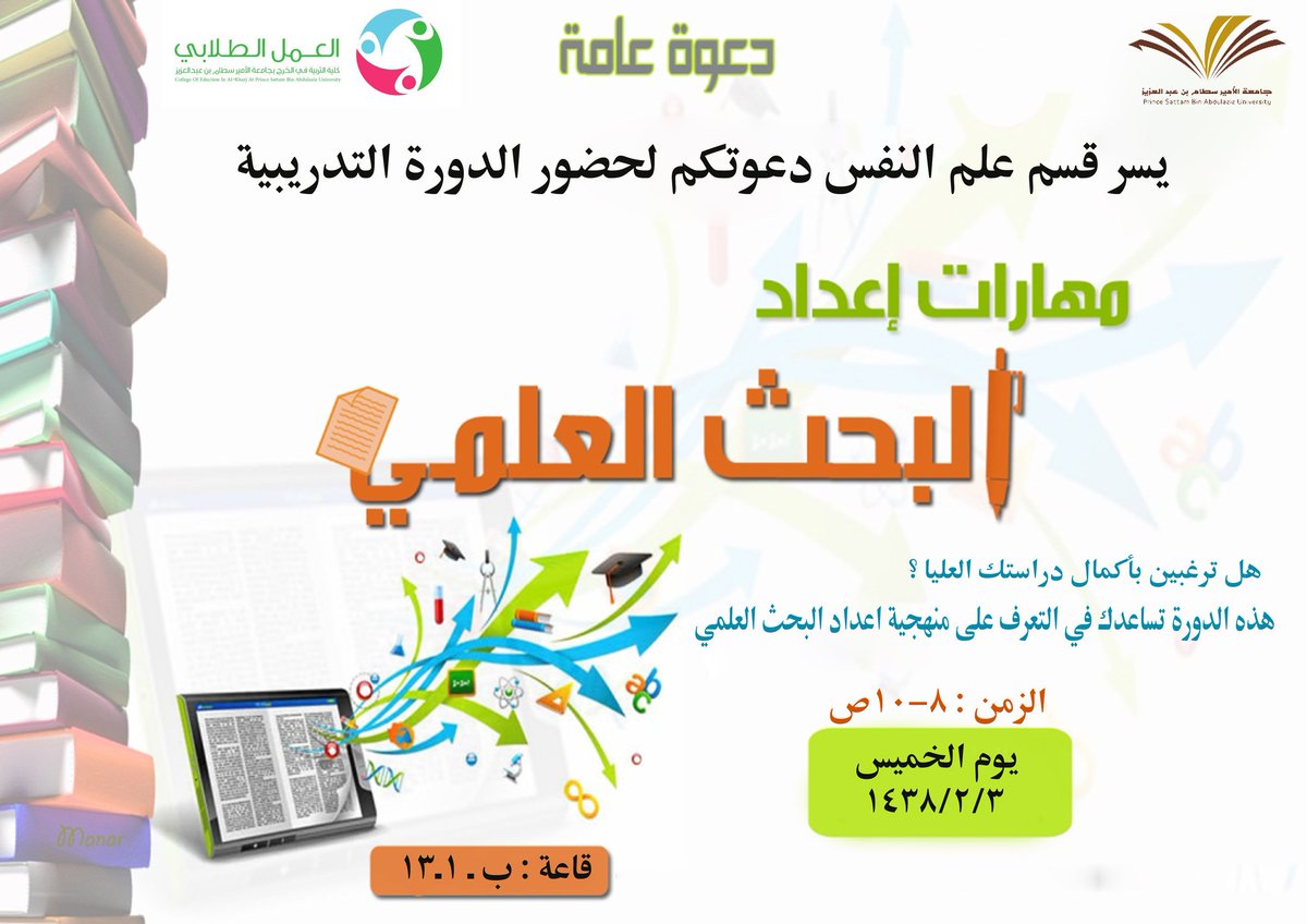 أقام قسم علم النفس بكلية التربية بالخرج -برعاية عميد الكلية الدكتور عبد الرحمن الرفدي- محاضرة (مهارات إعداد البحث العلمي) يوم الأحد الموافق ١٤٣٨/٢/٦هـ للدكتور خالد أحمد إبراهيم أستاذ علم النفس التربوي المساعد بكلية التربية، بيّن فيها للطالبات كيفية اكتساب مهارات إعداد البحث العلمي، تخلل المحاضرة أسئلة ونقاشات أثرتها.