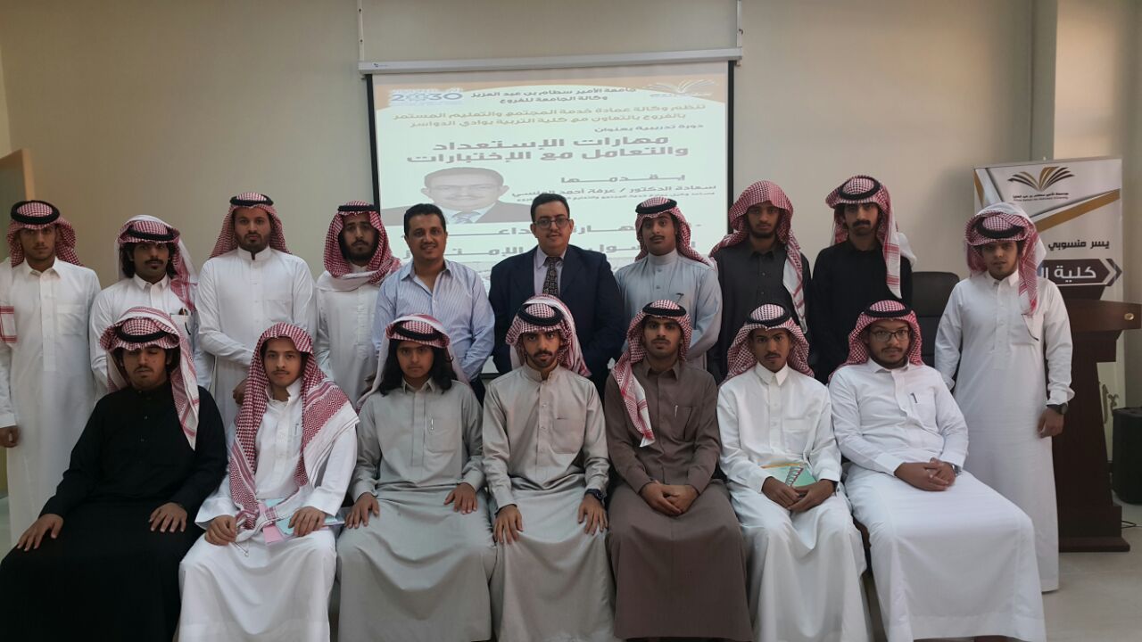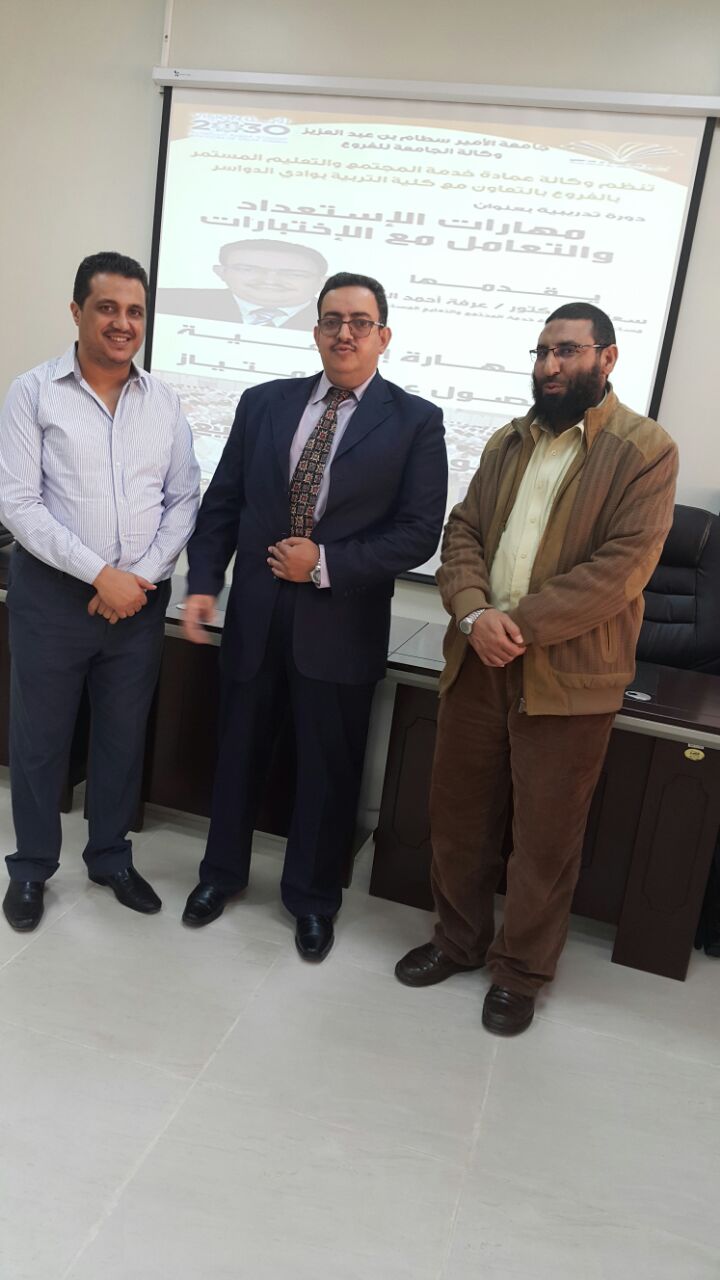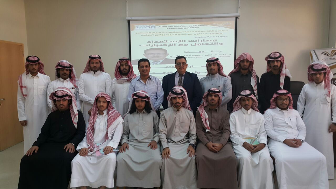 مع اقتراب انتهاء الفصل الدراسي الأول ، يستعد الطلاب والطالبات إلى الامتحانات النهائية. وهذا الأمر بالنسبة للكثير منهم ليس ممتعاً على الإطلاق . لذلك أطلقت وكالة عمادة خدمة المجتمع بوكالة الجامعة للفروع دورة تدريبية للطلاب بعنوان ( مهارات الاستعداد والتعامل مع الاختبارات ) بالتعاون مع كلا من كلية التربية وكلية الهندسة بوادي الدواسر على التوالي قدمها الدكتور / عرفة أحمد المنسي وقد تضمن الدورة 50 مهارة إبداعية للحصول على الامتياز ومنها :