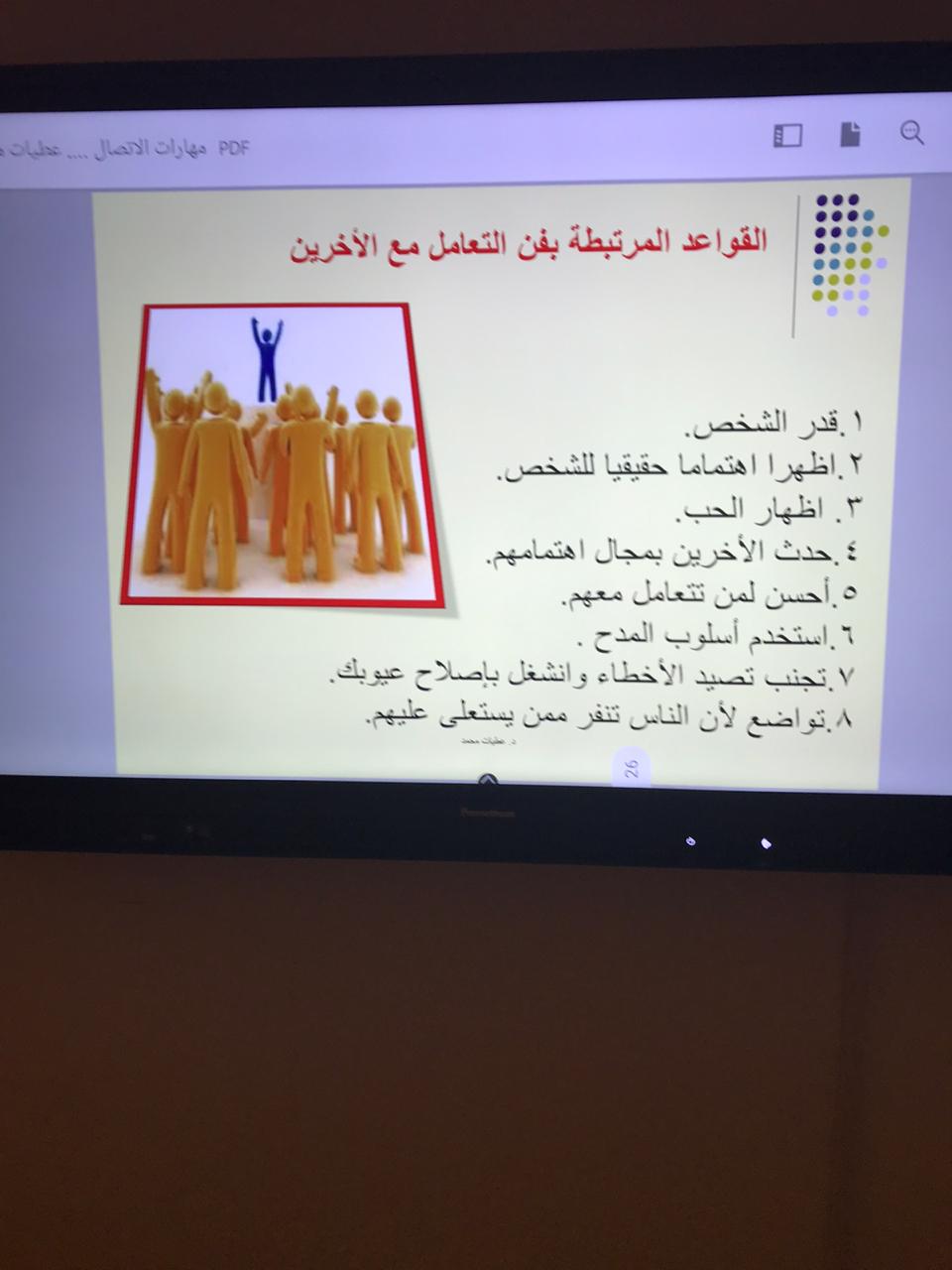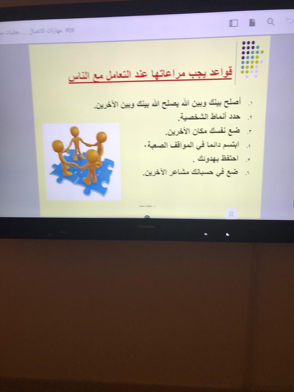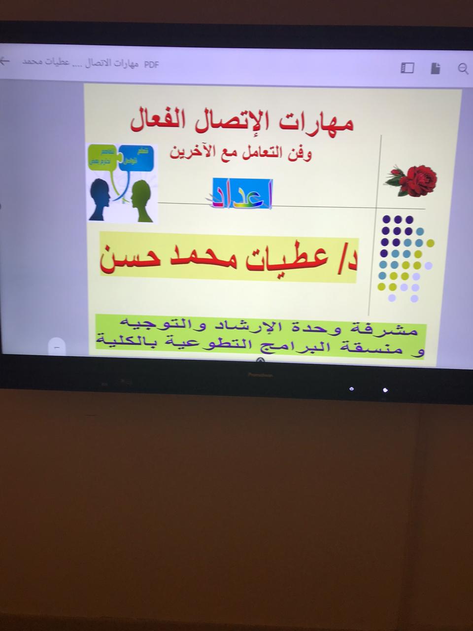 بفضل الله و بكل الجد والاجتهاد نبدأ الفصل الدراسي الثاني في كلية العلوم الطبية التطبيقية بوادي الدواسر. حيث أقامت اليوم الأثنين الموافق ٢/٦/١٤٤ وحدة التوجيه والإرشاد الطلابي بالتعاون مع وحدة العمل الطلابي ممثلة في البرامج التطوعية بالكلية دورة تدريبية للطالبات تحت عنوان "مهارات الاتصال الفعال و فن التعامل مع الآخرين" و ذلك في تمام الساعة ١٢ ظ بقاعة دراسية C10 قدمتها دكتورة عطيات محمد حسن مشرفة وحدة الارشاد والتوجيه الطلابي ومنسق البرامج التطوعية بالكلية. وقد شرفت الدورة بحضور سعادة الدكتورة/ ماجدة الجميل مساعدة العميد لشؤون الطالبات، سعادة الدكتورة/هيام أحمد مشرفة وحدة العمل الطلابي، سعادة الدكتورة/ مجيدة عبد العاصي مشرفة وحدة الخريجين بالكلية والطالبات بالكلية. وقد هدفت الدورة إلى إكساب الطالبات مهارات الاتصال الفعال وفن التعامل مع الآخرين. ذلك بالإضافة إلى معرفة مفهوم الاتصال الفعال، معوقاته، مهارات الاتصال والتواصل الفعال، قواعد يجب مراعتها عند التعامل مع الناس، طرق إعطاء النصيحة، عمل تمرينات للتطبيق العملي للدورة. وقد لاقت الدورة اهتمام وترحيب من الحضور.