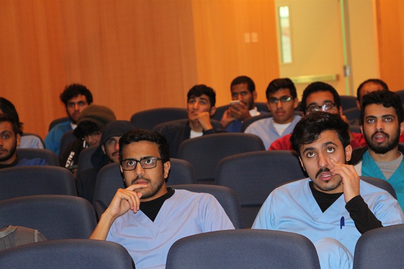 وبعد الانتهاء من المقطع تم الاستعانة بأحد الأخوان الصم الموظفين بالجامعة لشرح الكلمات الطبية وتمثيلها بالإشارة و تقديم بعض الاشارات المهمة للحضور .