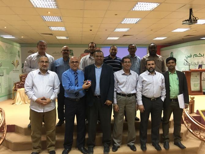 بتوجيهات عميد كلية الاداب والعلوم بالوادي د. سفر بن بخيت المدرع وضمن البرامج الأسبوعية لقسم الرياضيات قدم د. احمد مرسى عبد الله الأستاذ المساعد بقسم الرياضيات بالكلية محاضرة عامة عن "The Rubik Cube"مكعب روبيك و ذلك ضمن البرنامج الإسبوعى لنشاط الندوات بقسم الرياضيات بالكلية وقد تضمنت المحاضرة نبذة حول تاريخ و نشأة لعبة مكعب روبيك و العلاقات الرياضية المتعلقة به و أيضا المدخل الرياضي لطرق الحل و التى ترتبط بنظرية الزمر من خلال دراسة مجموعات التباديل المتماثلة (Permutation Groups) الزمر الجزئية القياسية (Normal Sub Groups) وقد حضر اللقاء منسوبو قسم الرياضيات بالكلية .