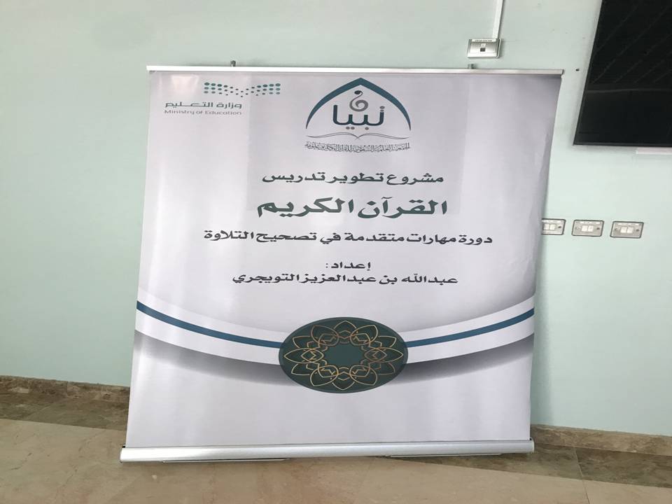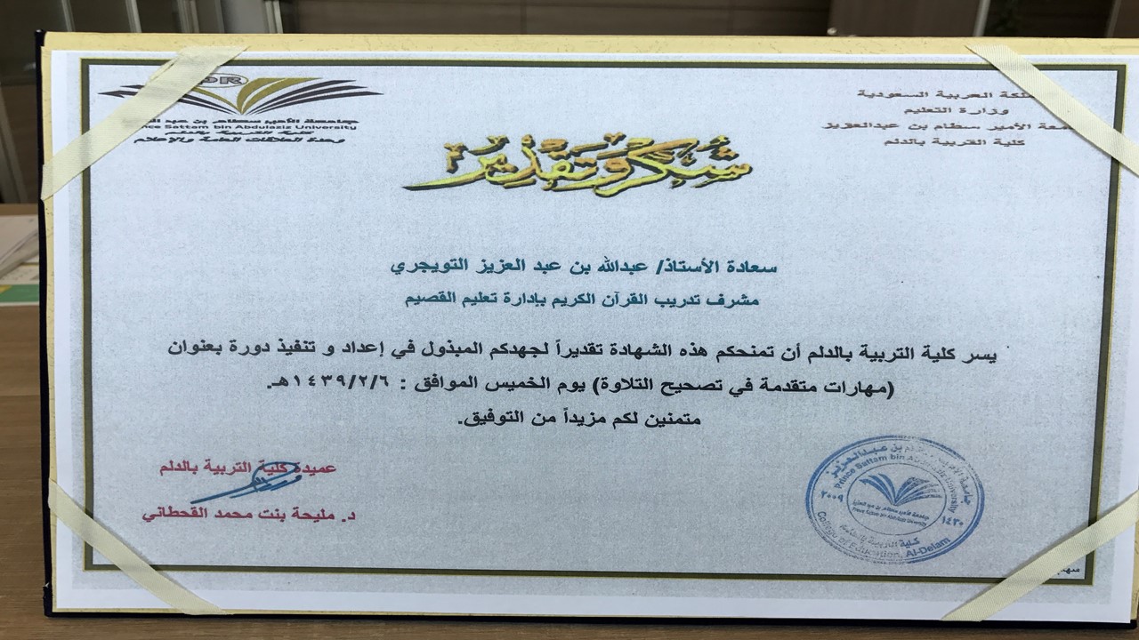 استضافت كلية التربية بالدلم مكتب التعليم ( القسم النسائي ) بالدلم الذي نظّم دورة تدريبية لمعلمات القرآن الكريم تحت عنوان(مهارات متقدمة في تصحيح التلاوة) الذي جاء ضمن مشروع تطوير القرآن الكريم بالشراكة مع وزارة التعليم و جمعية تبيان يوم الخميس الموافق 6/2/1439هـ في قاعة الشبكة بمقر الكلية . قُدمت هذه الدورة من قبل المدرّب أ/ عبدالله بن عبد العزيز التويجري – المشرف في إدارة تعليم القصيم.
