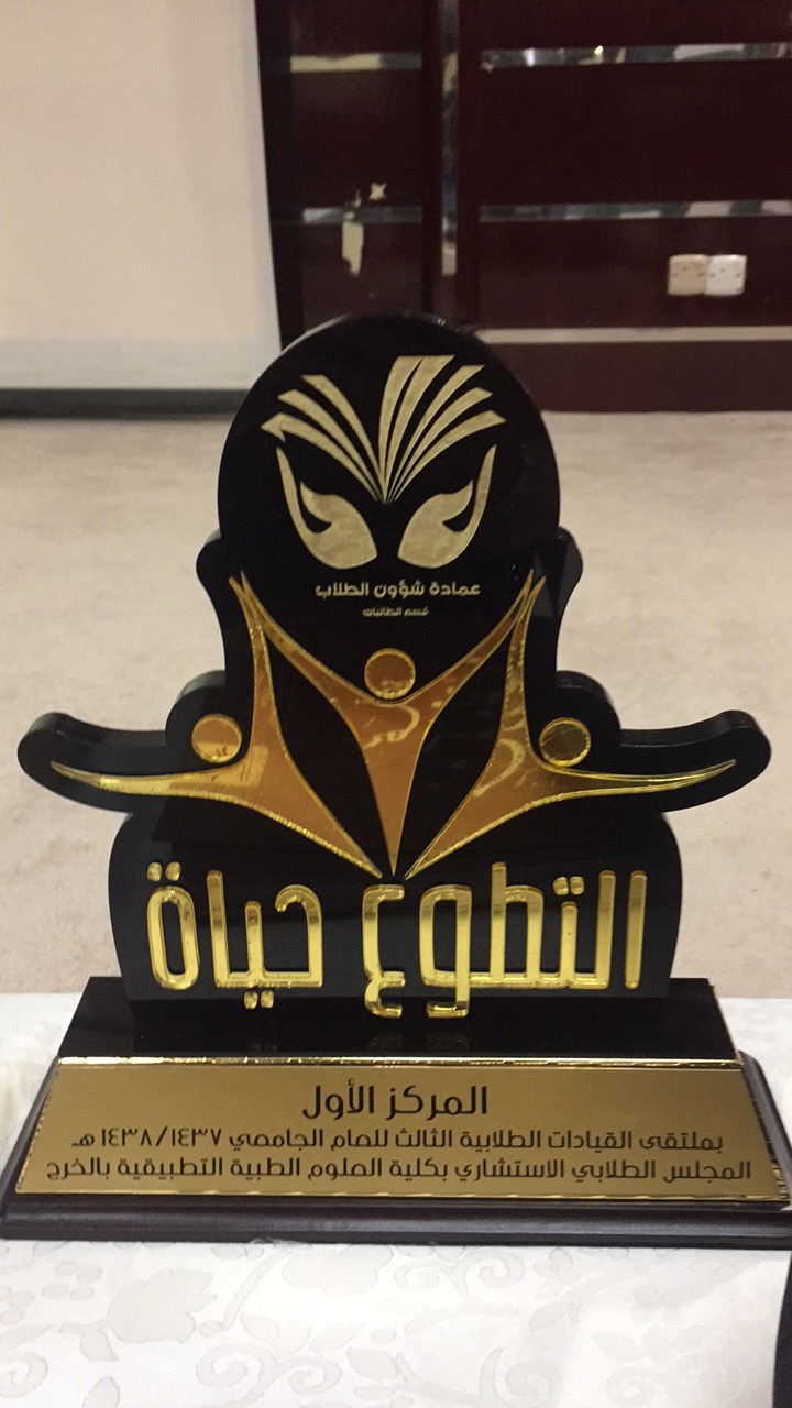 برعاية وكيلة عمادة خدمة المجتمع والتعليم المستمر الدكتورة نوف التميمي، أقام قسم الطالبات بعمادة شؤون الطلاب ملتقى القيادات الطلابية الثالث (التطوع حياة) وذلك يوم الثلاثاء 28/ 7/ 1438 في مسرح مبنى هداية، والذي أطلقت العمادة تصورومسابقة الملتقى من بداية العام الجامعي 1437/1438هـ، حيث سعت مجالس الطالبات الاستشارية بكليات البنات لترسيخ ونشر رؤية السعودية 2030 بكل فعاليات وأنشطة المجلس الطلابي، وتنافست لتطبيق فكرة تطوعية تخدم مجتمع الخرج بشكل خاص والمملكة بشكل عام، وذلك من خلال مسابقة (التطوع حياة)، والتي تهدف الى تعزيز دور المجالس الطلابية للقيام بدور فعال تجاه المجتمع، وتعزيز روح الانتماء للوطن والجامعة بشكل عملي، والمشاركة بتحقيق رؤية 2030، بالإضافة الى خلق فرص تطوعية تتصف بالحداثة والاستمرارية. افتتح الملتقى بالنشيد الوطني والقرآن الكريم ، ثم ألقت سعادة وكيلة عمادة شؤون الطلاب الدكتورة دلال بنت خالد المطرفي كلمة رحبت فيها براعية الحفل وبالحضور بمختلف فئاتهم ، استعرضت فيها الهدف من عقد ملتقى القيادات الطلابية بمبادرات من المجالس الاستشارية لتعزيز دور المجتمع الطلابي خاصة والوطن بشكل عام، وشكرت ادارات الكليات المشاركة والتي كان لها الاثر في نجاح الملتقى، وأشادت فيها بنجاح امتداد انجازات المجالس الطلابية لجميع الكليات حتى البعيدة منها. ثم ألقى عميد شؤون الطلاب الدكتور ثلاب بن عبدالله الشكرة كلمة استهلها بالترحيب بالحضور، وشدد على حرص واهتمام العمادة على إقامة الملتقيات الطلابية السنوية لما لها من فائدة للطالب اولاً وللجامعة ثانياً، وختمها بالشكر لوكيلة ومنسوبات قسم الطالبات بالعمادة على الجهود الرائدة .ثم عُرضت المبادرات التطوعية المتنافسة وعددها تسع مشاريع تطوعية والتي خضعت للتحكيم من قبل محكمين خبراء بالعمل التطوعي ووفقا لبنود تحكيم دقيقة ومصممه خصيصا لمشاريع خدمة المجتمع مع مراعاة أهداف وشروط ملتقى القيادات الطلابية الثالث، وكانت بداية العروض مع مشروع (العمل التطوعي جزء من الحضارة الإنسانية) من المجلس الطلابي الاستشاري بكلية الآداب والعلوم بوادي الدواسر، ثم مشروع (بصمة فن) من المجلس الطلابي الاستشاري بكلية التربية بالدلم، فالمشروع التطوعي (التغيير لوطن كبير) من المجلس الطلابي الاستشاري بكلية العلوم والدراسات الانسانية بالخرج،تبع ذلك عرض مشروع (قصة كيمو) من المجلس الطلابي الاستشاري من كلية التربية بوادي الدواسر، فمشروع (الخير الخفي) من المجلس الطلابي الاستشاري بكلية العلوم والدراسات الإنسانية بحوطة بني تميم، فعرض لحملة زملوني من المجلس الطلابي الاستشاري بكلية العلوم والدراسات الإنسانية بالسليل، تبع ذلك عرض مشروع (العيادة المتنقلة) من المجلس الطلابي الاستشاري بكلية العلوم الطبية التطبيقية بالخرج، ثم عرض المجلس الطلابي الاستشاري بكلية هندسة وعلوم الحاسب مشروعه (إعادة تدوير الأجهزة الإلكترونية)، ثم ختمت عروض المبادرات بمشروع (اكسني بدخانك لعلها المنجية) من المجلس الطلابي الاستشاري بعمادة السنة التحضيرية. تم بعد ذلك اعلان نتائج مسابقة التطوع حياة حيث حصل على المركز الأول مشروع العيادة المتنقلة للمجلس الطلابي الاستشاري بكلية العلوم الطبية التطبيقية بالخرج، وحصل على المركز الثاني مشروع إعادة تدوير الأجهزة الإلكترونية من كلية هندسة وعلوم الحاسب، والمركز الثالث مشروع التغيير لوطن كبير من كلية العلوم والدراسات الانسانية بالخرج، كما حصل على المركز الرابع الى التاسع المشاريع التالية: 4: الخير الخفي، 5:بصمة فن، 6: اكسني بدخانك لعلها المنجية، 7:حملة زملوني، 8: العمل التطوعي جزء من الحضارة الإنسانية، 9:قصة كيمو،كما تم تكريم محكمين المشاريع التطوعية، والطالبات الحاصلات على درع التميز بأفضل سجل إنجاز قيادي (قائدة). وفي نهاية الحفل قدمت وكيلة عمادة شؤون الطلاب باقة من الورود والشكر والعرفان لراعية الحفل على تشريفها ورعايتها