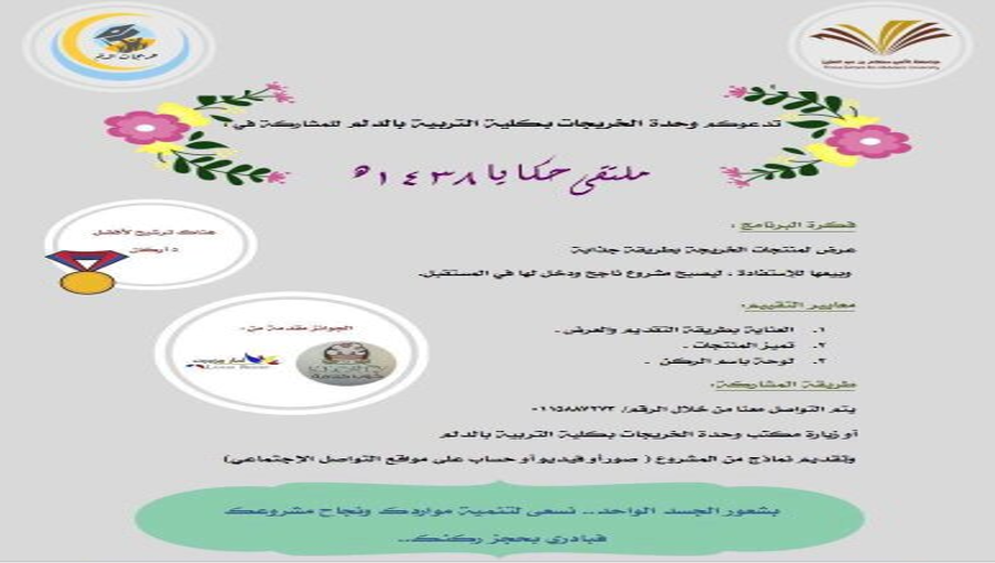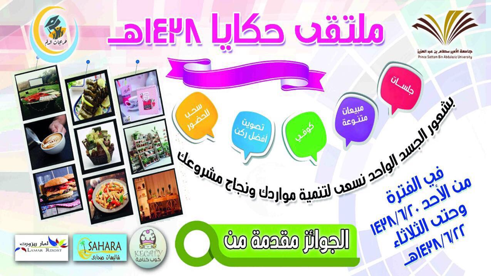 نظمت وحدة الخريجات ملتقى بعنوان (حكايا) ، حيث بدأ الملتقى يوم الأحد الموافق 20/6/1438هـ في تمام الســـــاعة 10صباحاً، والذي أستمر لمدة ثلاثة أيام بالبهــو الشتوي للكلية .