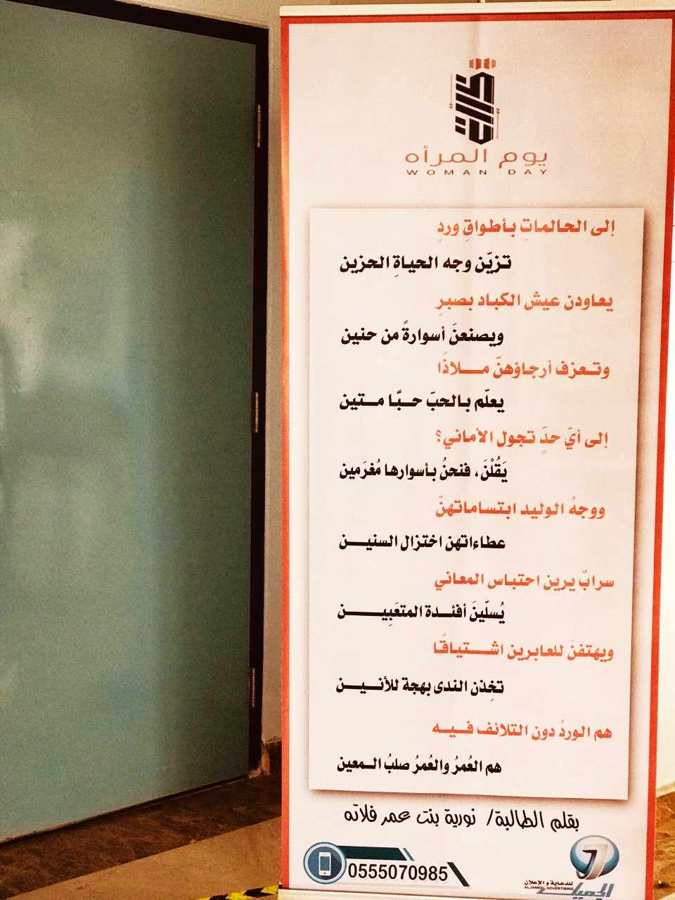 نظمت شعبة الانشطة الثقافية والاجتماعية التابعة لوحدة العمل الطلابي بكلية التربية بالدلم تحت اشراف ا.نوره العويمر "ملتقى يوم المرأة" احتفاءً بيوم المرأة العالمي وذلك يوم الاحد الموافق ٨مارس ٢٠٢٠ في تمام الساعة ١٠ صباحاً في مسرح الكلية وذلك بهدف توعية الطالبات بحقوقهن وتثقيفهن بدورهن الرئيس في المجتمع والتعرف على طموحاتهن وعرض إنجازاتهن في مختلف المجالات.