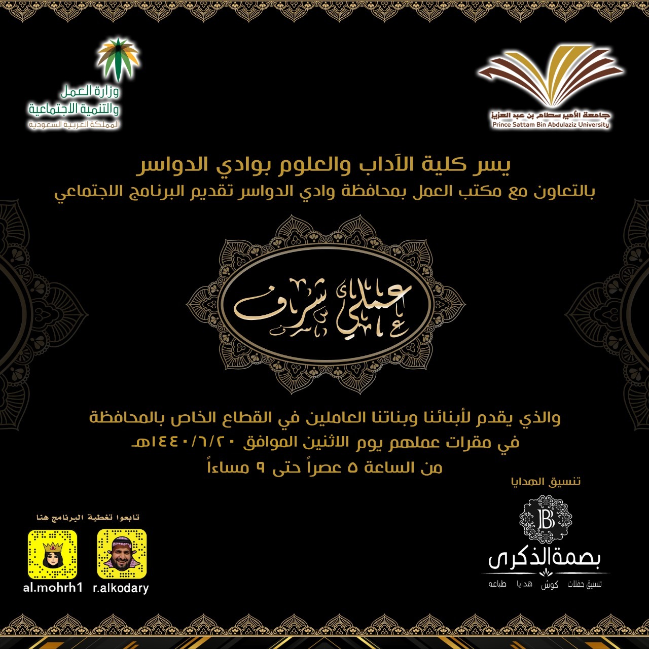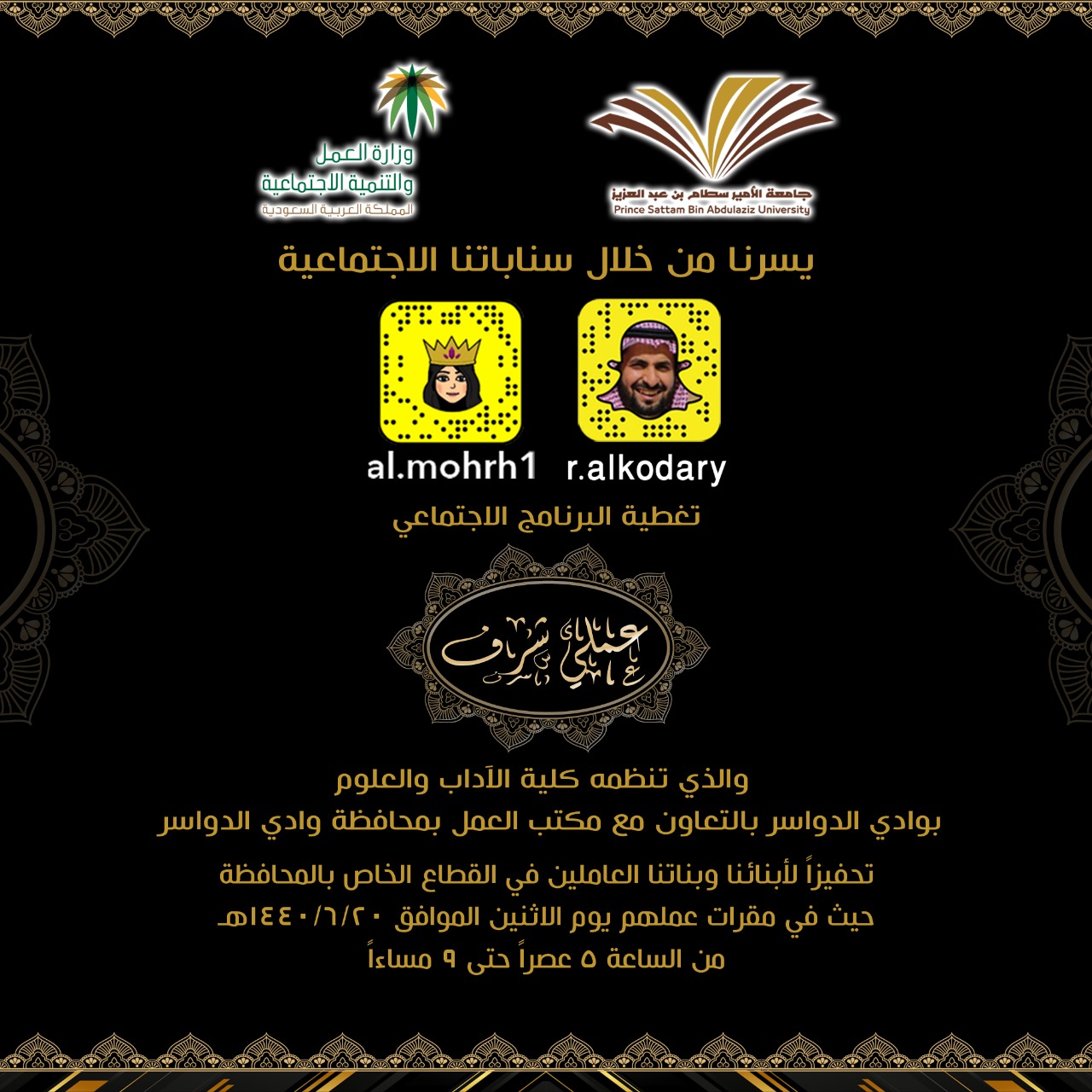 يسر كلية الآداب والعلوم بوادي الدواسر بالتعاون مع مكتب وزارة العمل بمحافظة وادي الدواسر ان تقدم البرنامج الاجتماعي( عملي شرف ) يوم الأثنين الموافق 1440/6/20هـ والذي يتضمن زيارة طلاب كليات وادي الدواسر في مقر عملهم سواءً الخريجين او من هم ما زالوا مستمرين بمقاعد الدراسة .