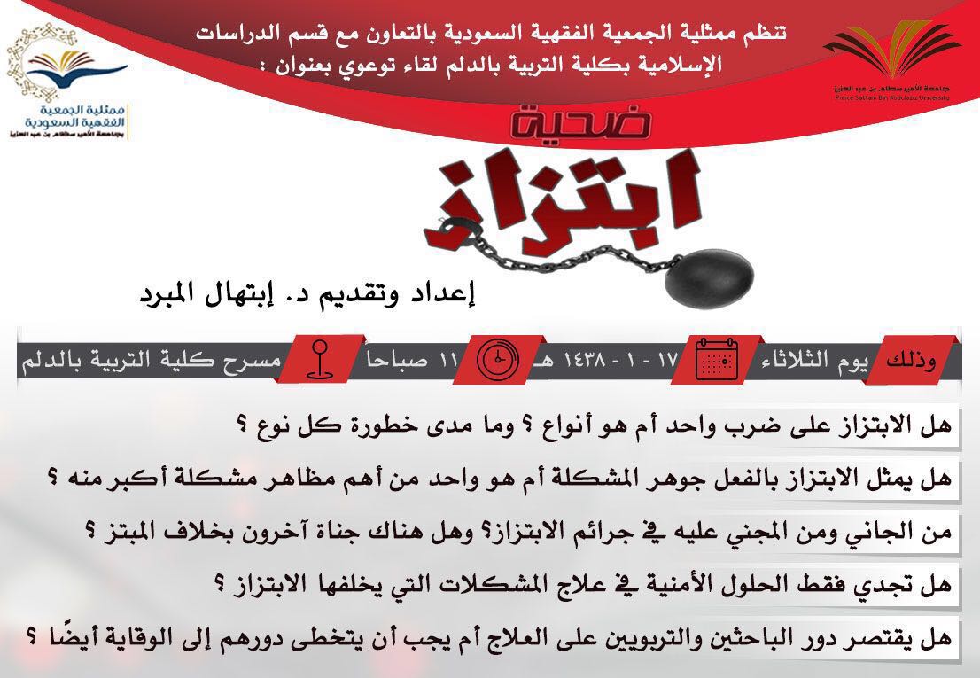 نظمت ممثلية الجمعية الفقهية بجامعة الأمير سطام بالتعاون مع قسم الدراسات الإسلامية بكلية التربية بالدلم ، وذلك ضمن الأسبوع الإرشادي الذي تنظمه وحدة الإرشاد الأكاديمي لقاءاً توعويًا بعنوان " ضحية ابتزاز" من إعداد وتقديم د.ابتهال المبرد ممثلة اللجنة النسائية للجمعية الفقهية بجامعة الأمير سطام بن عبدالعزيز ورئيسة قسم الدراسات الإسلامية بالكلية ، يوم الثلاثاء الموافق 17/1/1438هـ ، الساعة 11ظهراً على مسرح الكلية.
