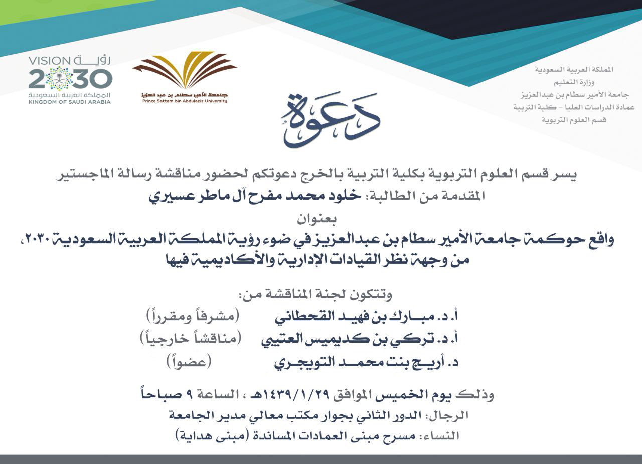 تناقش يوم الخميس القادم الموافق 29/1/1439هـ الساعة التاسعة صباحًا أول رسالة ماجستير في الإدارة والتخطيط التربوي قسم العلوم التربوية – كلية التربية، جامعة الأمير سطّام بن عبد العزيز والمقدمة من الطالبة خلود محمد مفرح آل ماطر عسيري، بعنوان: واقع حوكمة جامعة الأمير سطّام بن عبد العزيز في ضوء رؤية المملكة العربية السعودية 2030من وجهة نظر القيادات الإدارية والأكاديمية.
